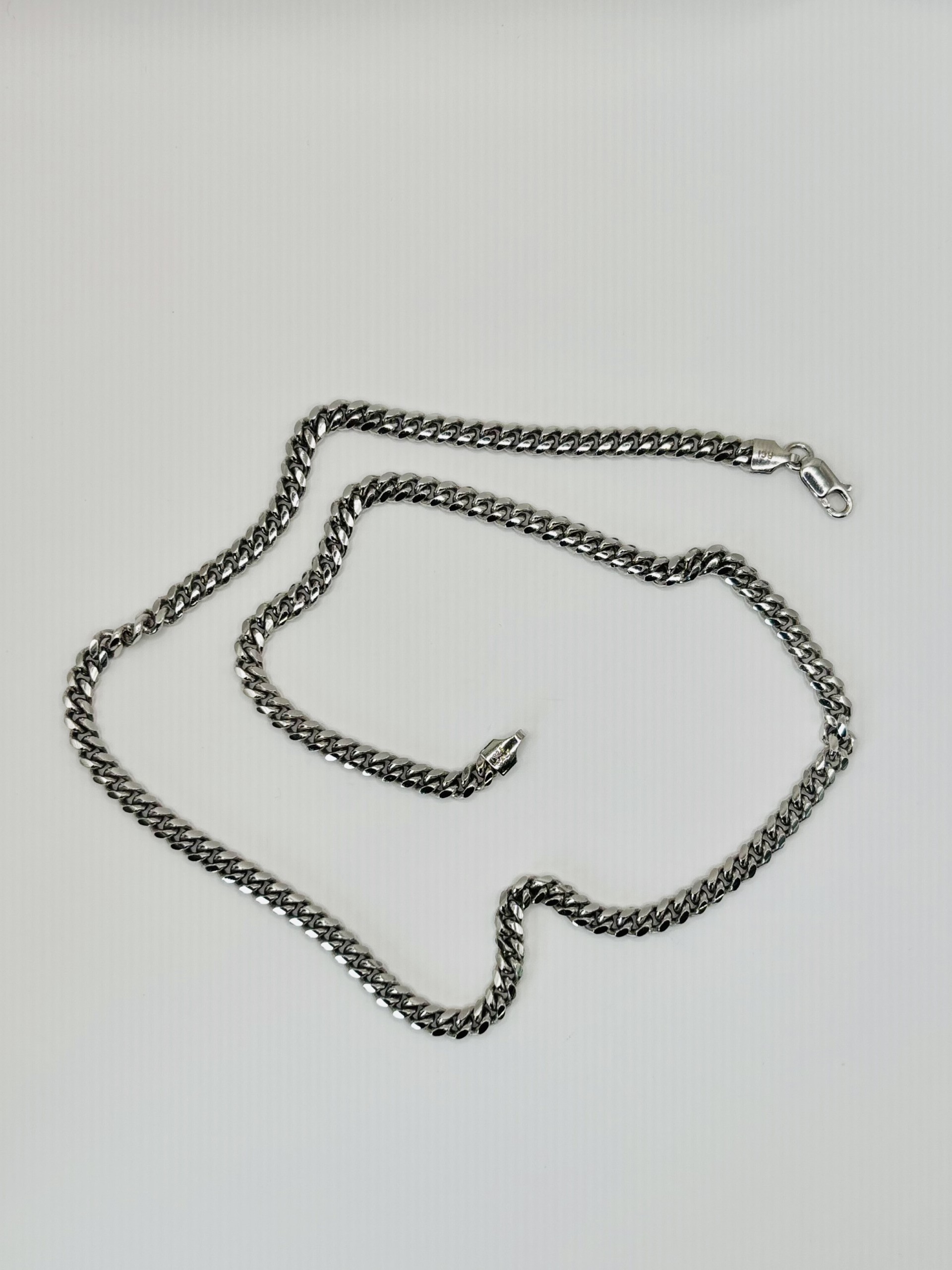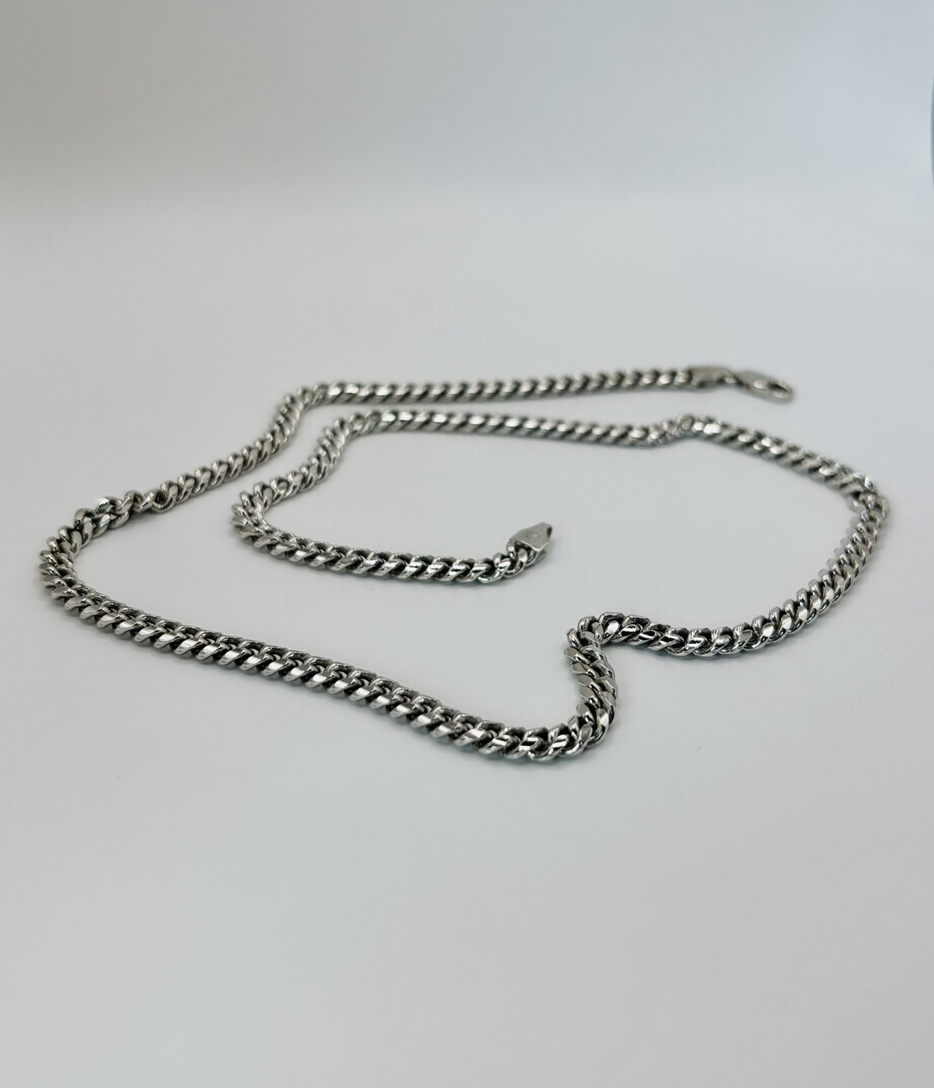 Sterling silver curb chain with lobster clasp. 4.9mm thick and 20″ long. Weighs 32 grams.