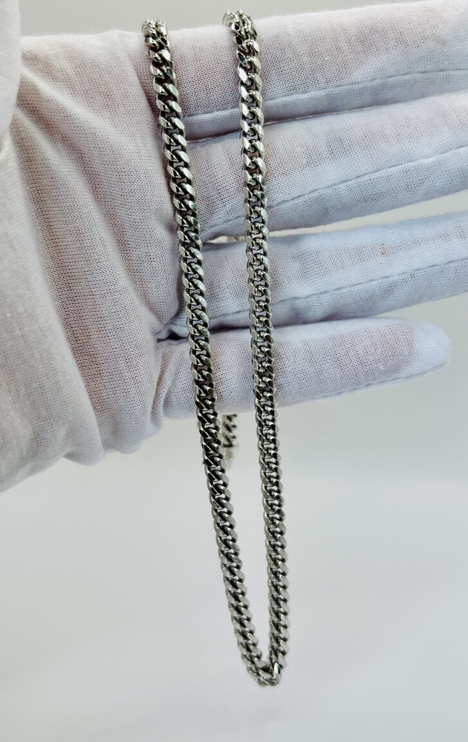 Bold and substantial, this sterling silver curb chain is a true statement piece. Measuring 20″ long and 4.9mm wide, it boasts a solid construction and a hefty 32-gram weight that feels luxurious in hand and on the neck. The classic curb link design is polished to a brilliant shine, making it a versatile accessory that can be worn alone for a sleek, powerful look or paired with a favorite pendant. A timeless chain for those who appreciate quality and style.