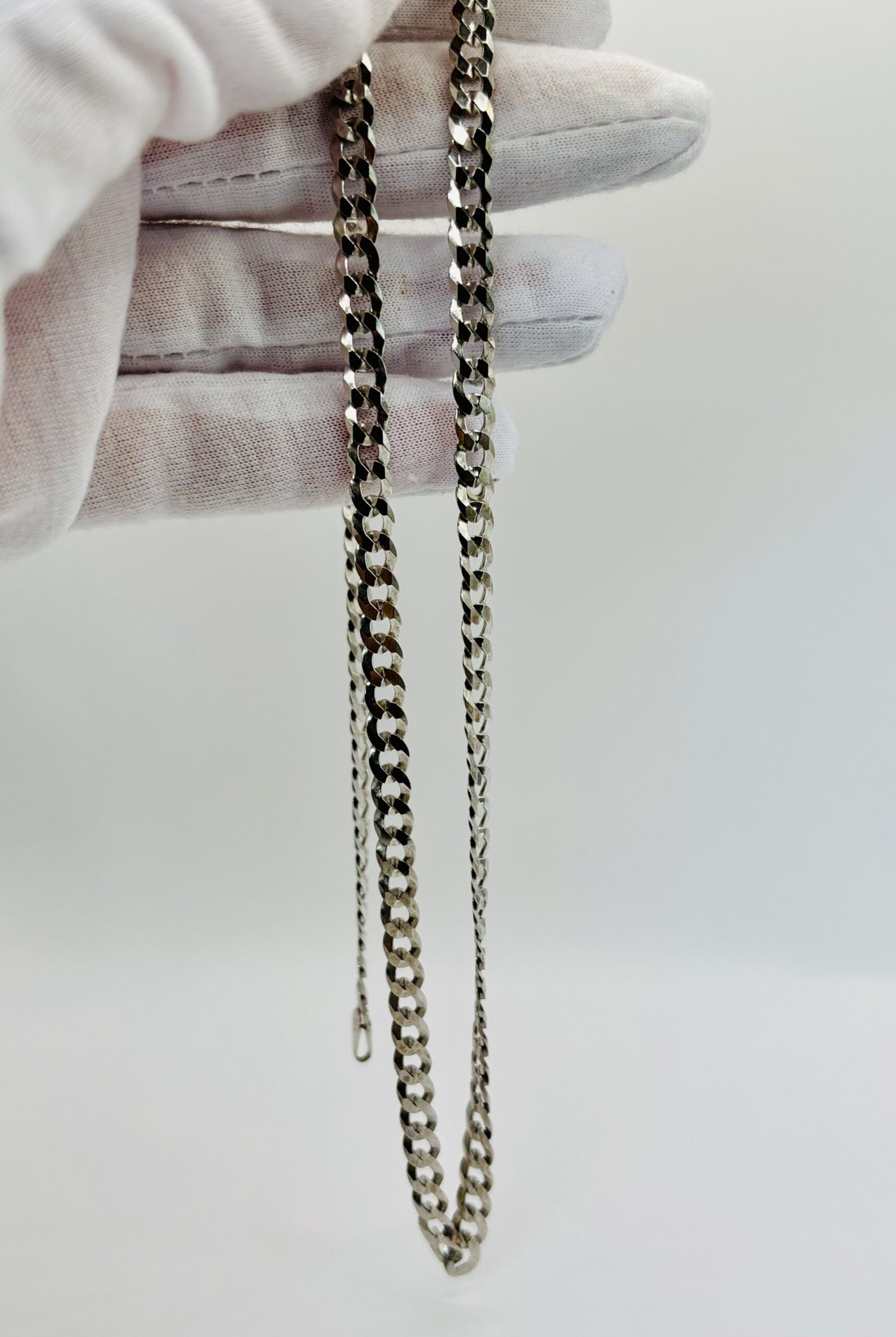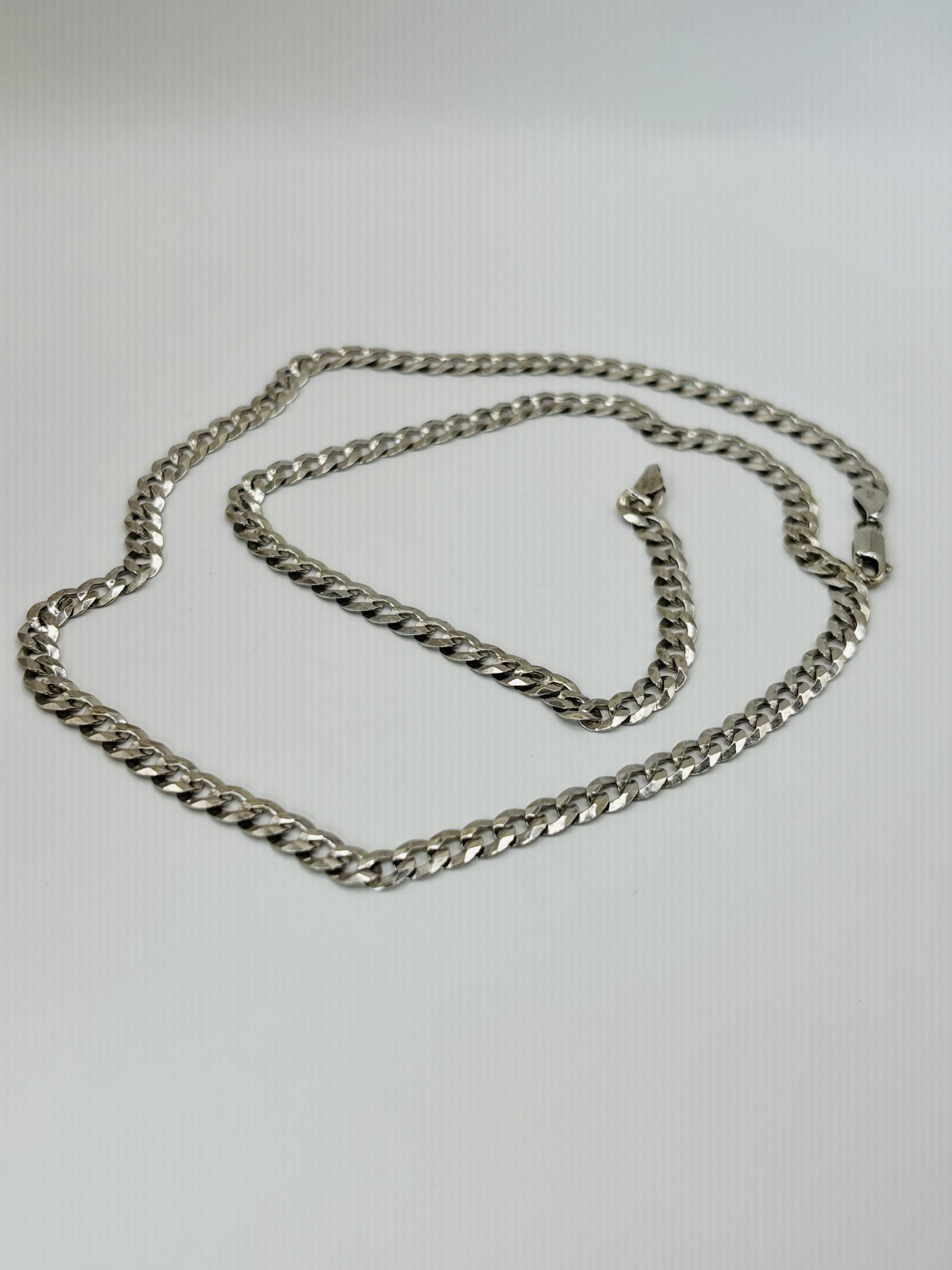 Sterling silver flat curb chain with lobster clasp. 5.5mm wide and 24″ long. Weighs 16 grams.