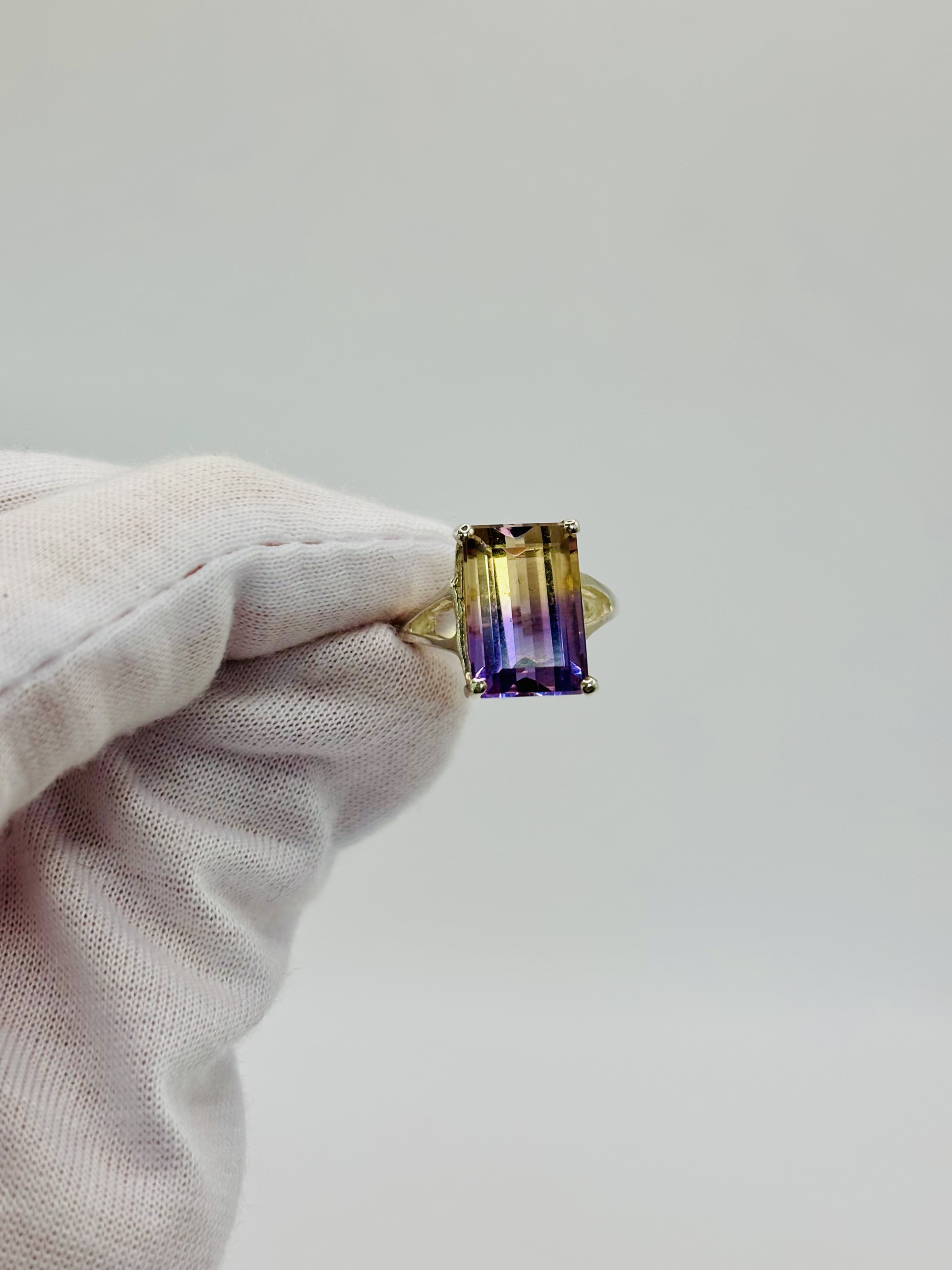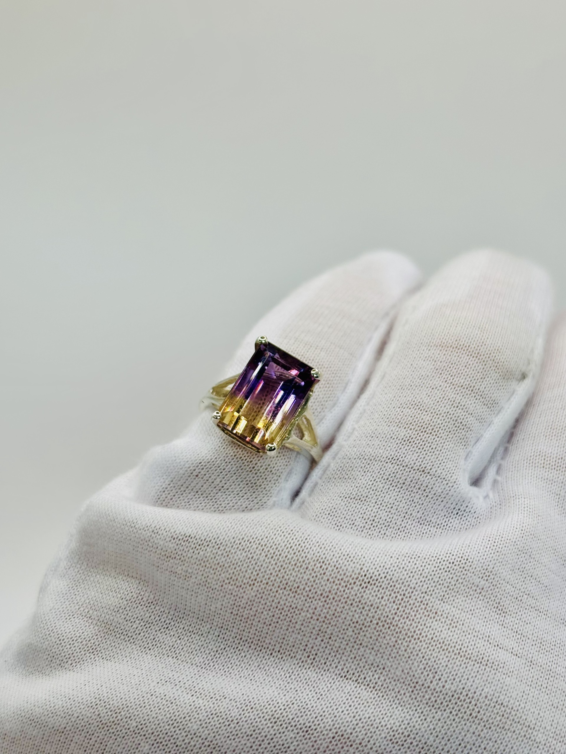 A sleek and elegant sterling silver ring designed to let its gemstone shine. At the center rests a striking emerald-cut ametrine, a rare natural quartz that combines the deep violet hues of amethyst with the golden warmth of citrine in one crystal. Its natural fusion creates a mesmerizing play of color, shifting with the light from regal purple to sunny yellow. Set in a clean solitaire style with a graceful split shank, this ring is all about showcasing the stone’s beauty—simple, yet unforgettable.