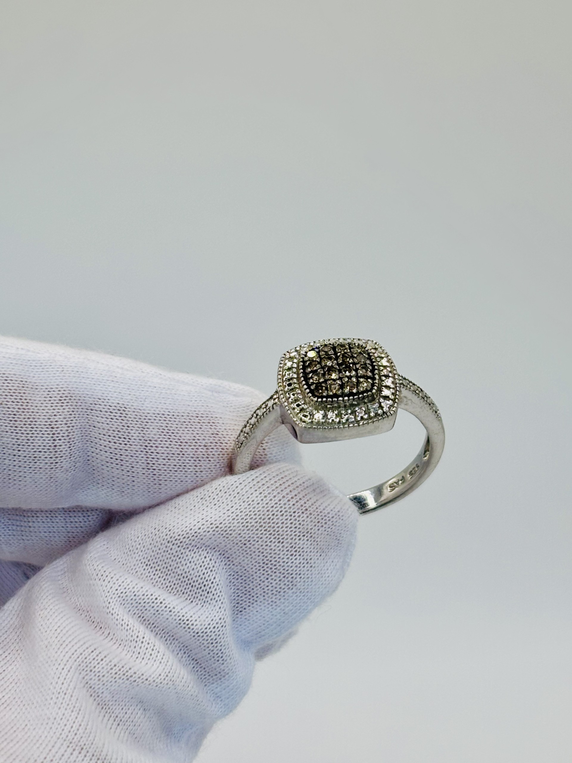 Sterling silver ring with cluster set round brown diamonds centered around silver bead prongs. Ring size 11, sizeable.