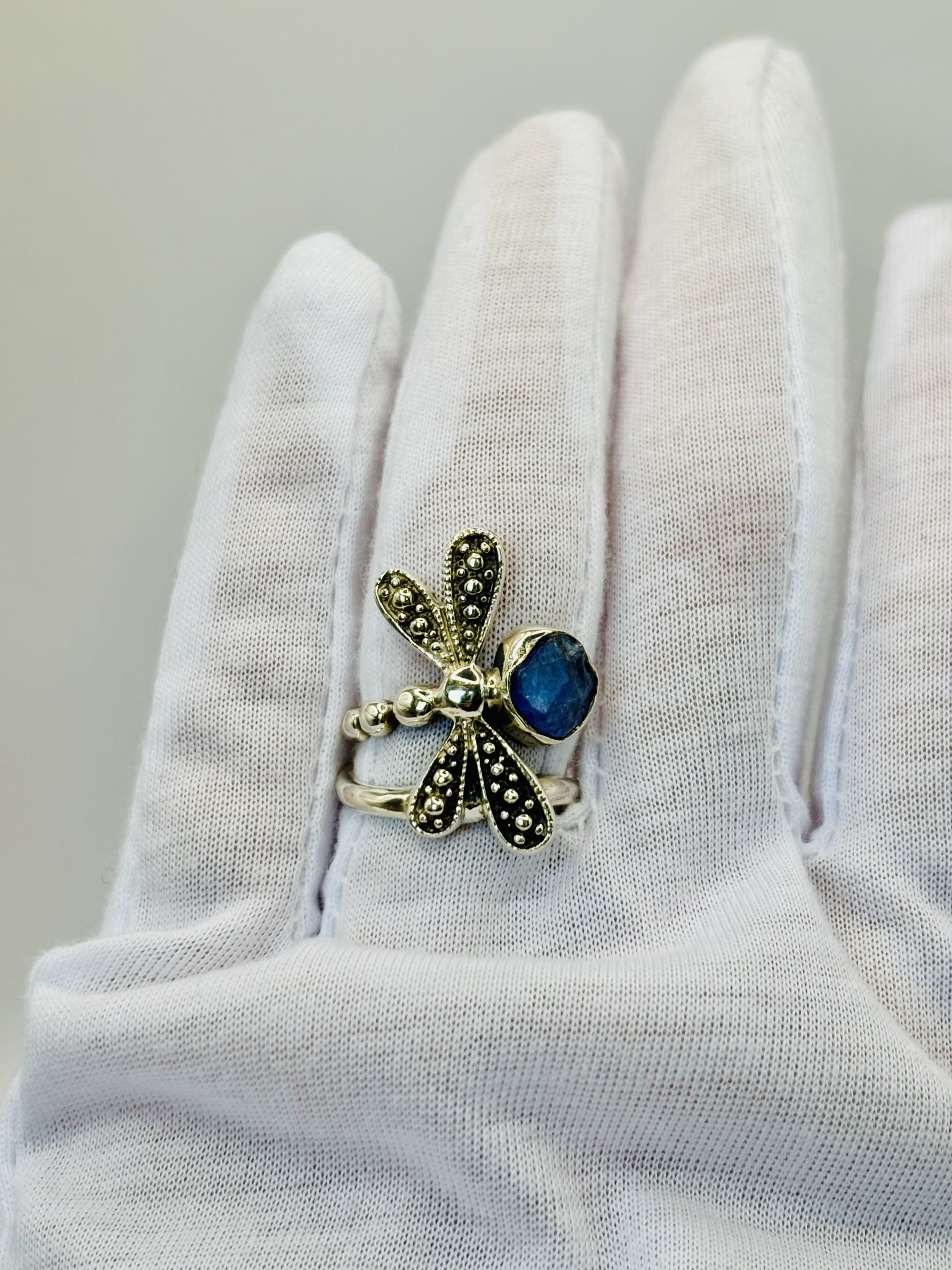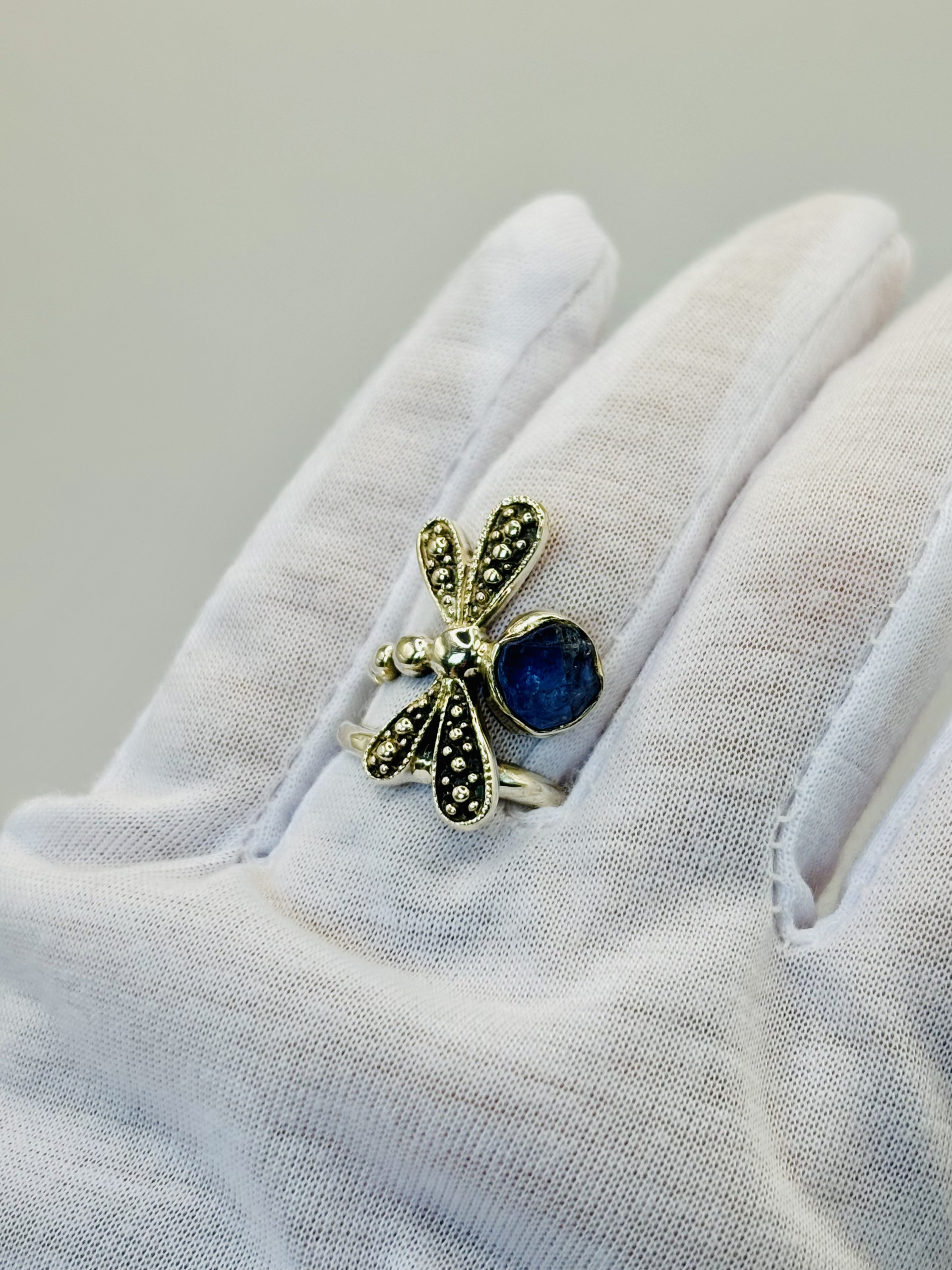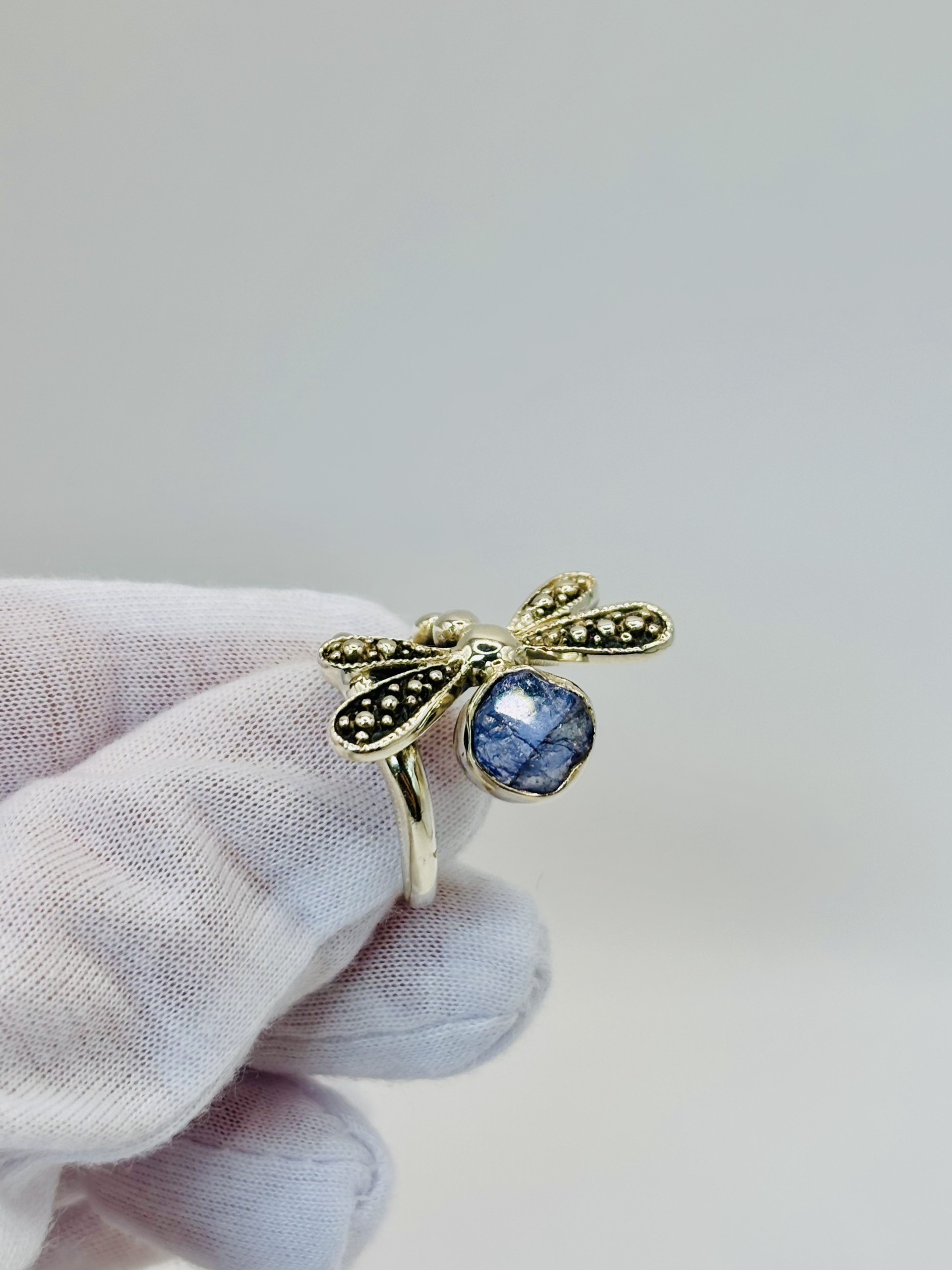 This unique ring captures the spirit of transformation and freedom with a dragonfly that gracefully wraps around the finger twice. Crafted in sterling silver, the design balances symmetry with a touch of organic charm. A rough, bezel-set tanzanite stone accents the side, adding raw beauty and a hint of mystical color. A truly cool piece that feels both whimsical and powerful.