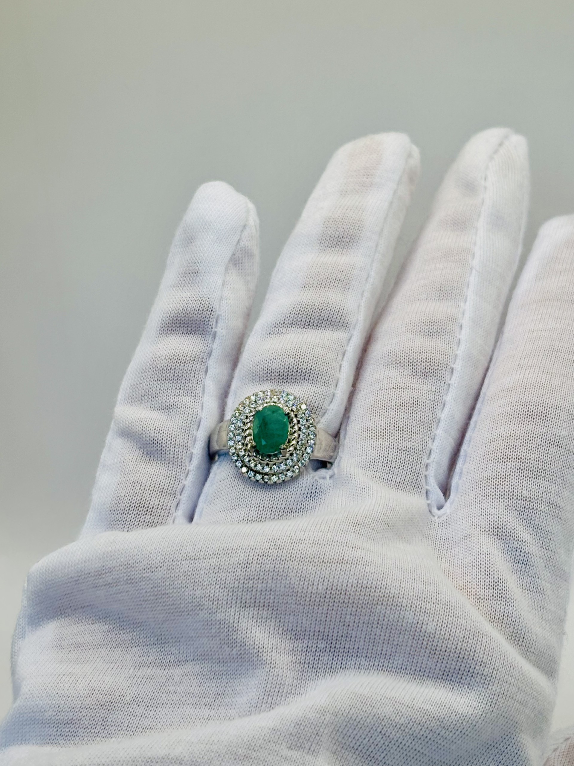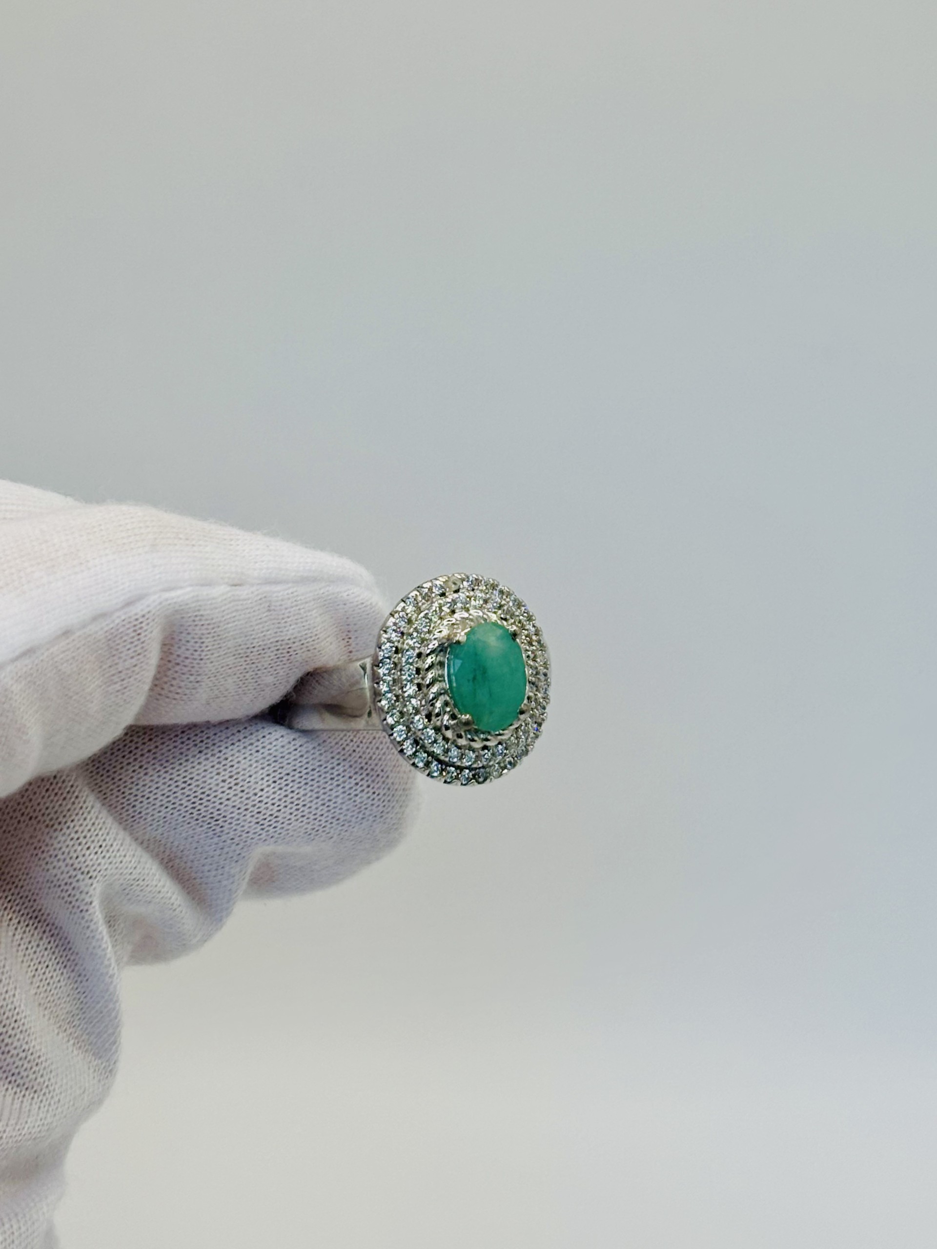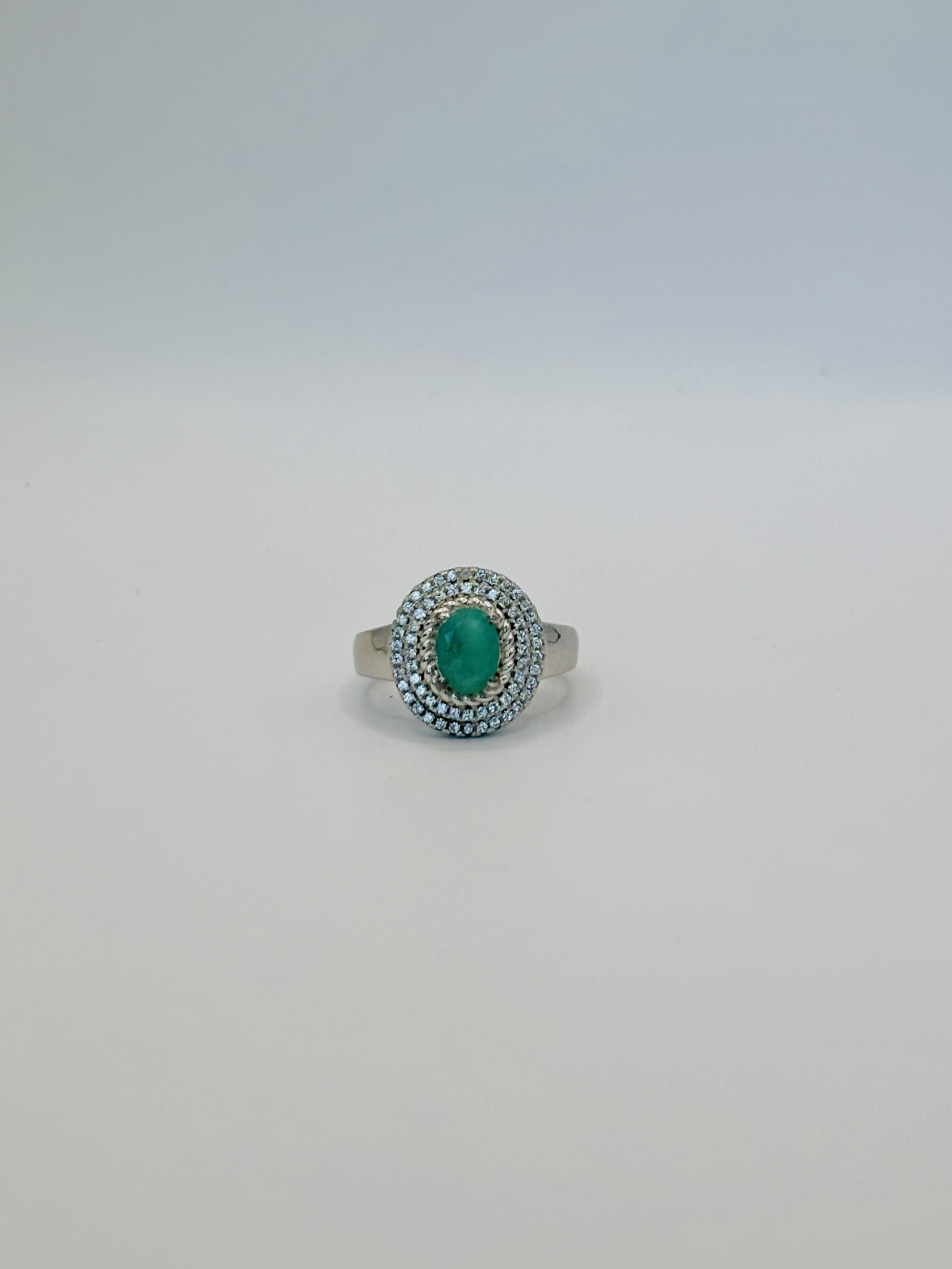Sterling silver ring with an estimated 1ct oval natural emerald center surrounded by a double halo of white topaz gemstones. Ring size 7, sizeable.