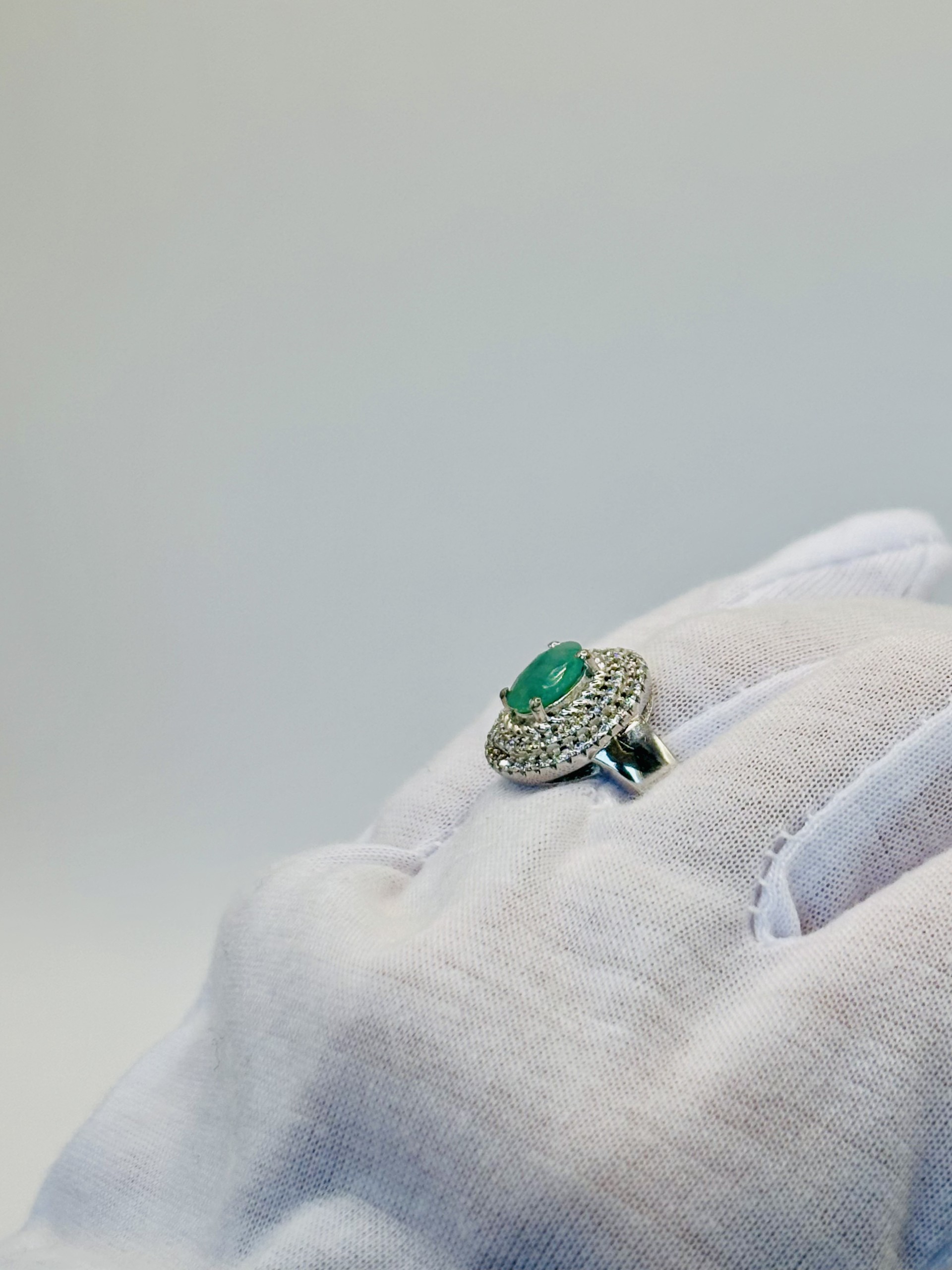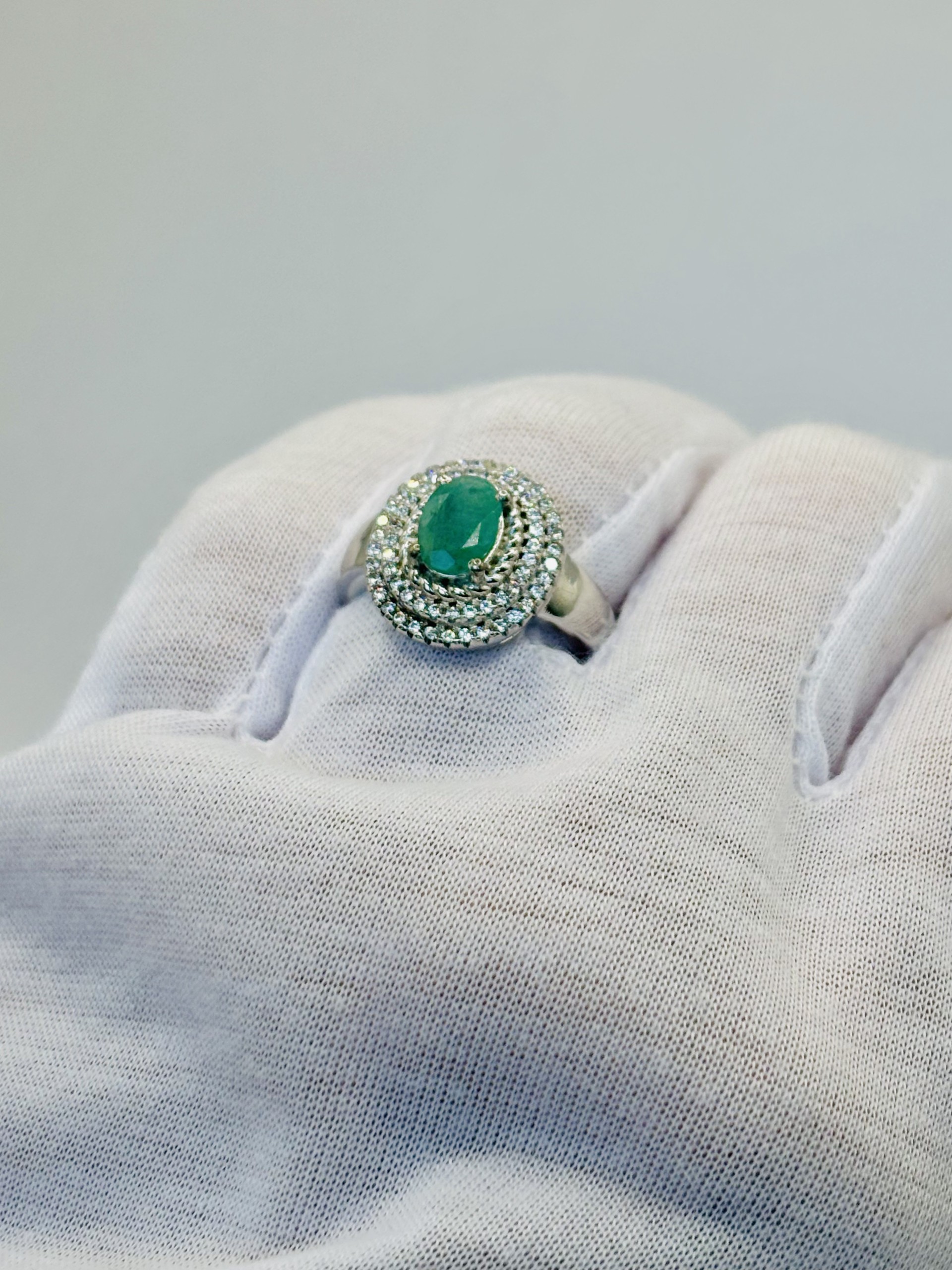 This captivating sterling silver, emerald ring features an oval-shaped gem, in its soft green brilliance, set at the center like a treasured jewel from another time. Encircling the emerald is a finely crafted rope-style bezel, adding texture and vintage appeal. Beyond that, two sparkling halos of white topaz shimmer with light, casting a radiant glow that dances with every movement. The band itself is slightly wider, offering a bold, substantial feel on the finger — a perfect balance of weight and elegance, making this ring as powerful as it is beautiful.
