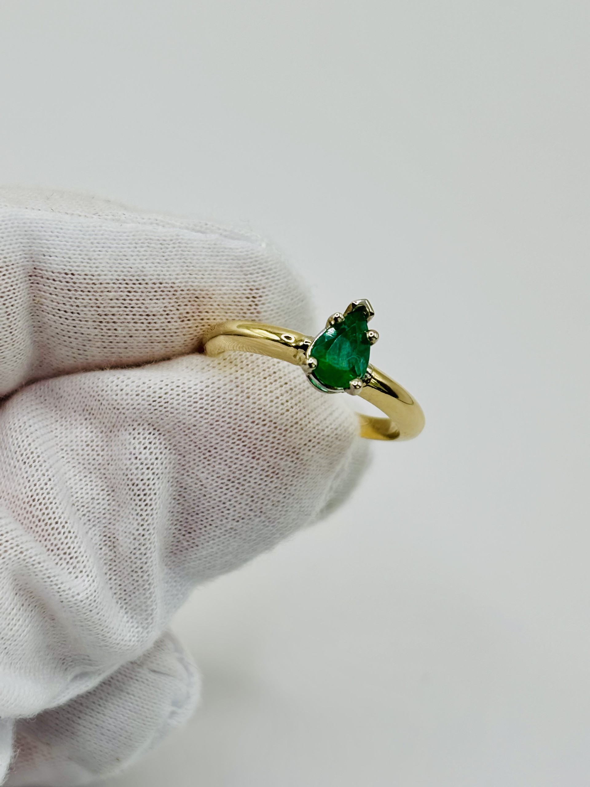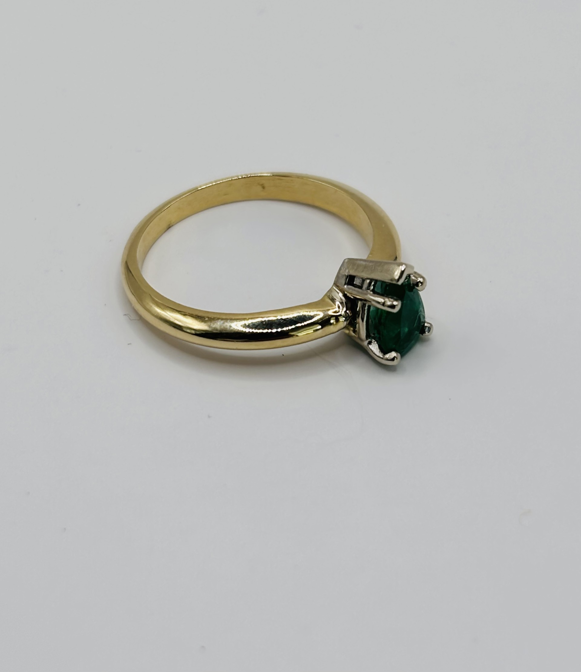 14k yellow gold ring with white gold prongs. Set with .55ct natural fine emerald, pear shape. Finger size 6.5, sizeable. Center stone 7x5mm approx.