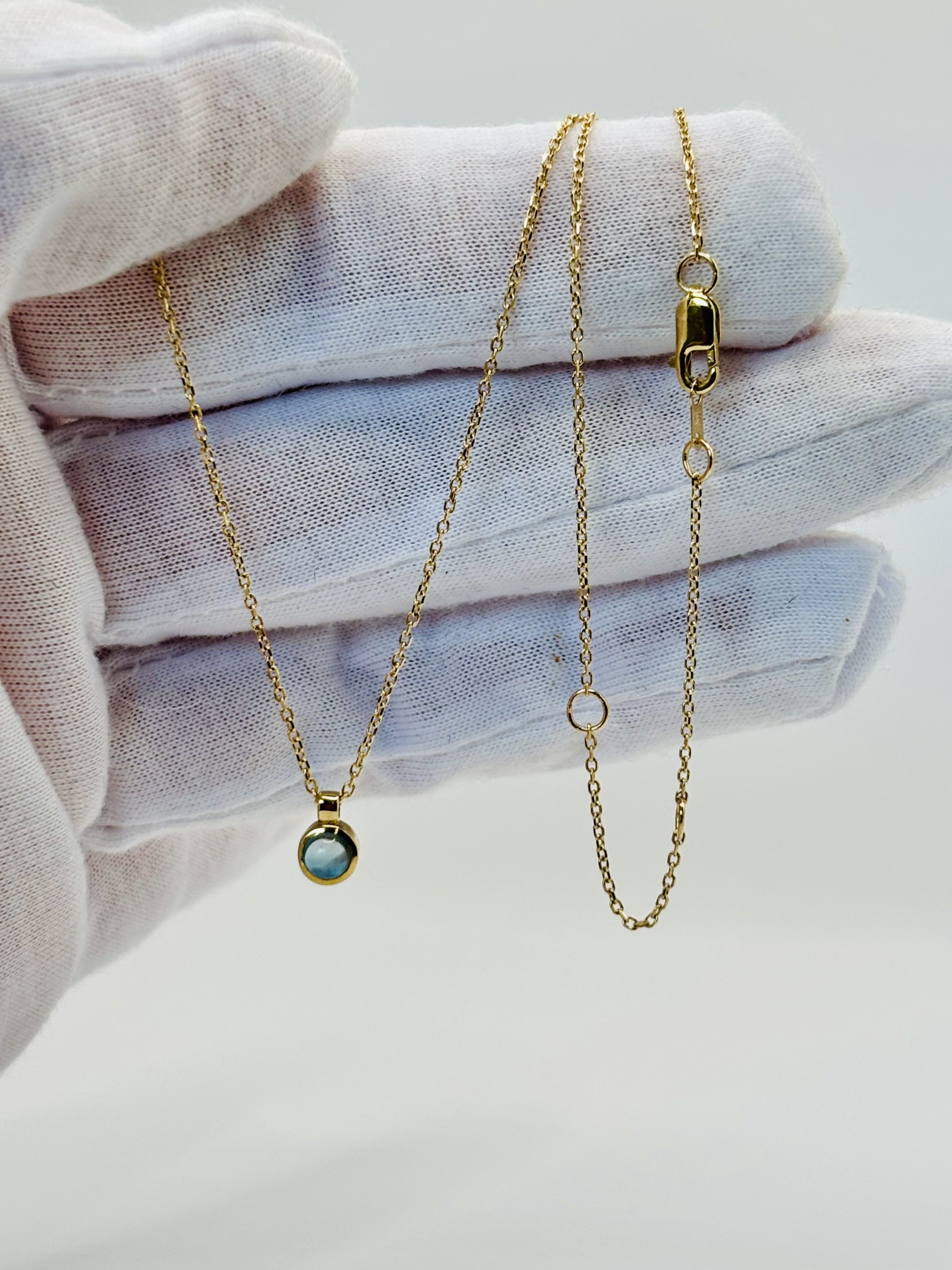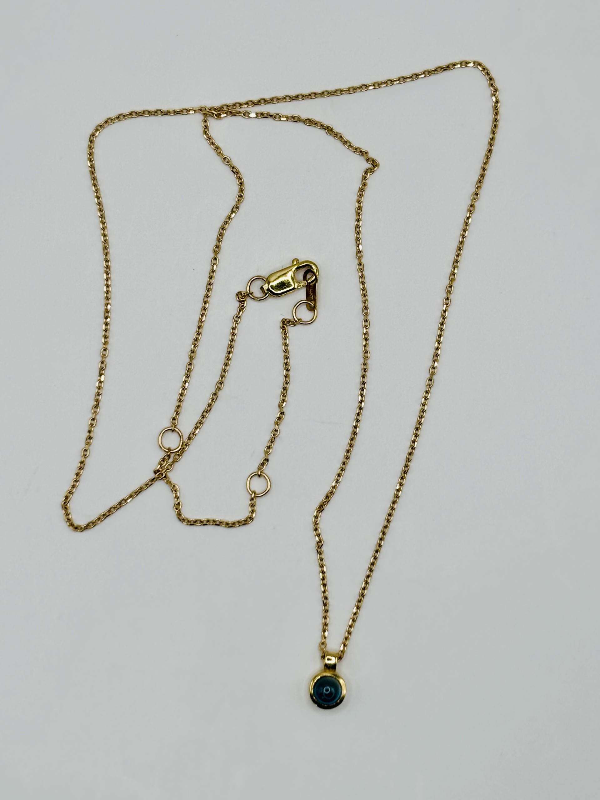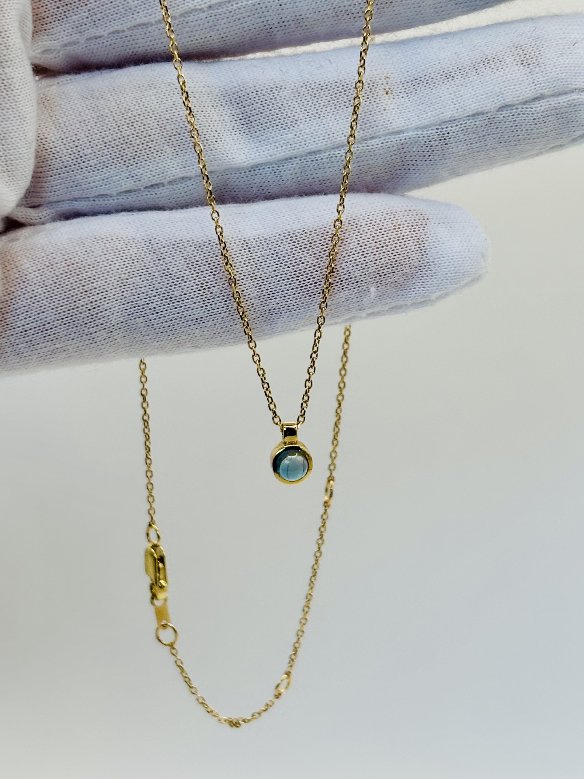 14k yellow gold necklace with 5mm round cabochon London blue topaz. Includes gold cable chain with 16, 17 and 18 inch length options.