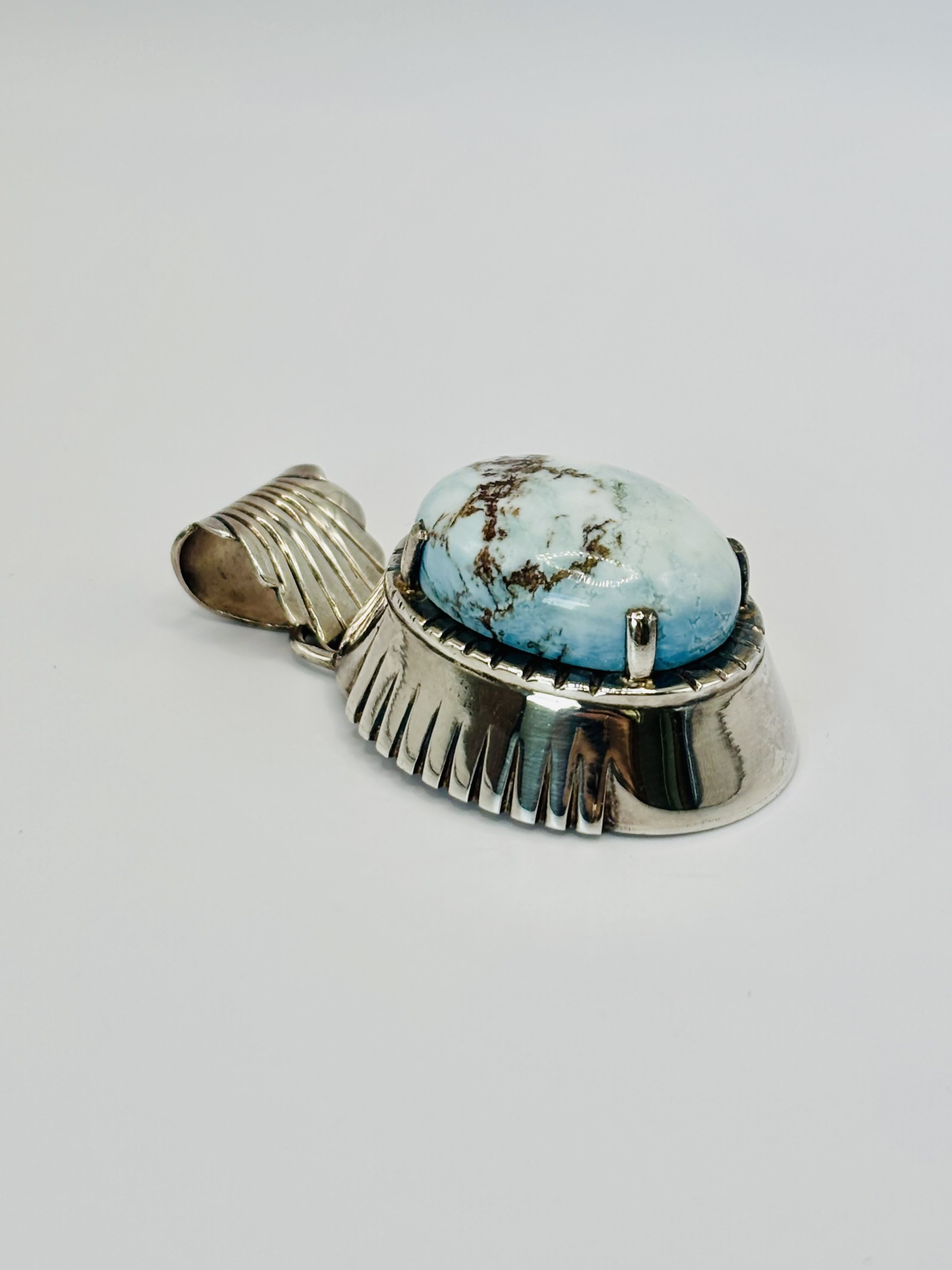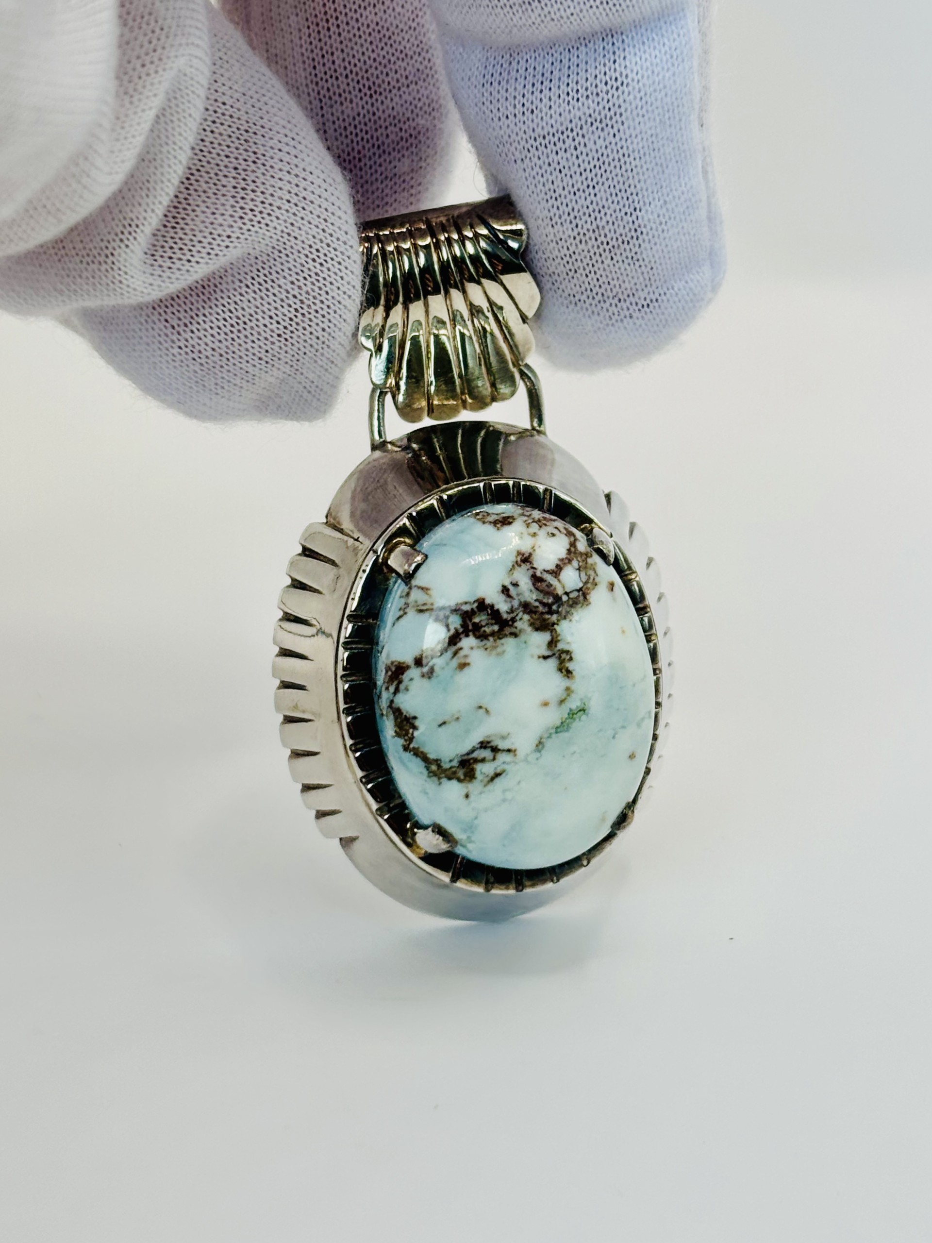 Sterling silver large oval shape turquoise pendant. Dimensions are 2″ from top of bail to bottom of setting by 1.25″ width. Chain not included.