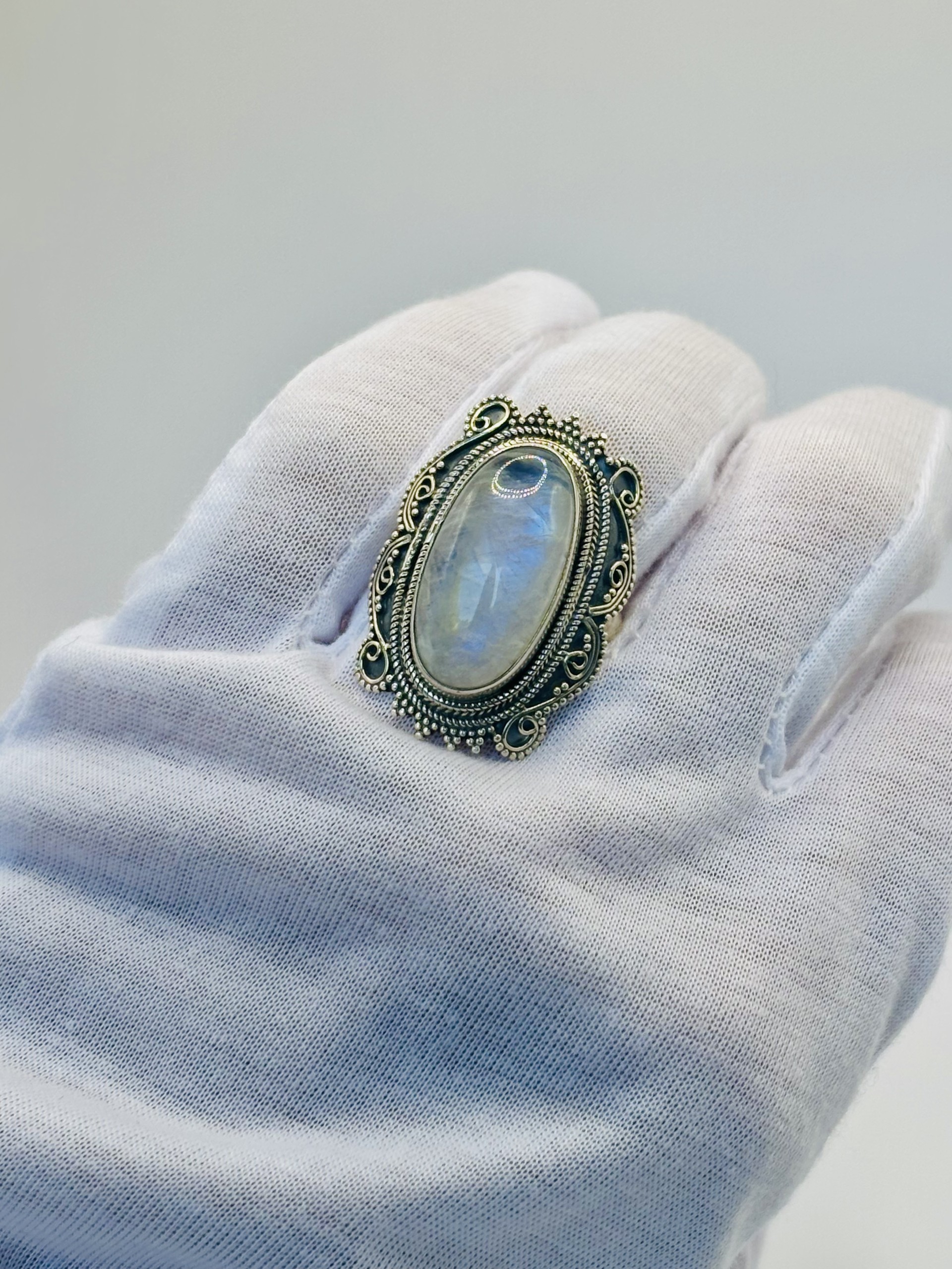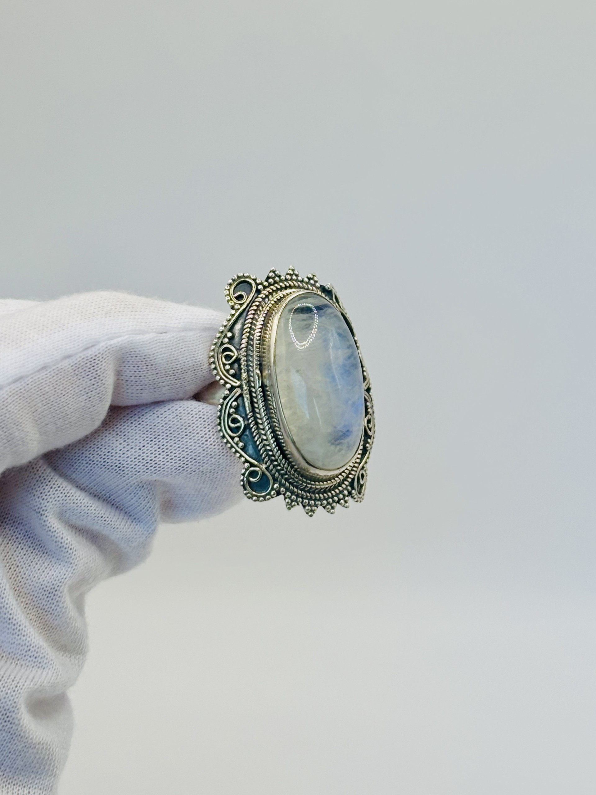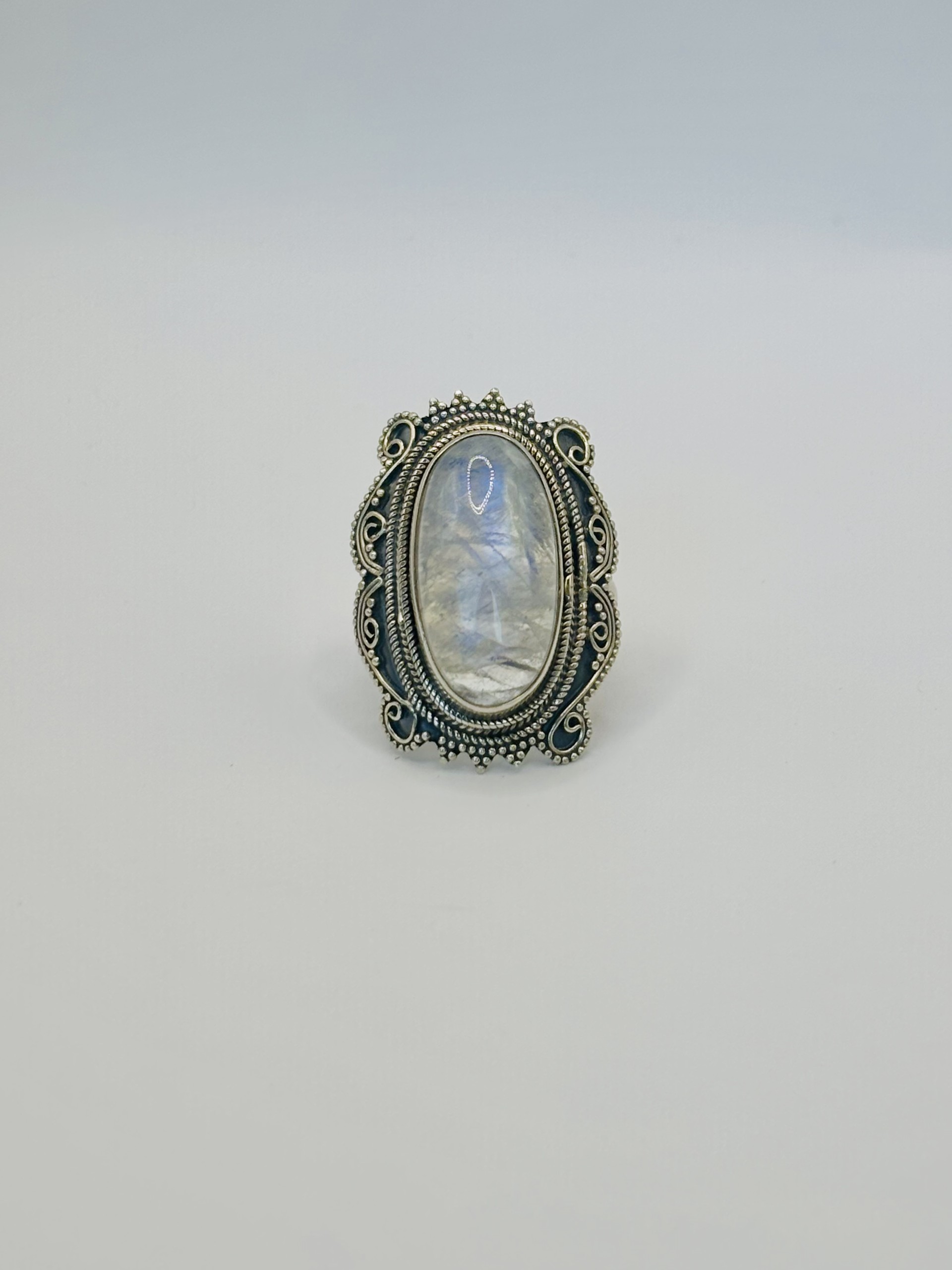 A mesmerizing 22mm moonstone takes center stage in this breathtaking ring, its ethereal glow shifting with soft flashes of blue and pearly light as it moves. The elongated gem gracefully spans the finger, creating an elegant silhouette that feels both regal and mystical. Surrounding the moonstone is an intricate lace-like frame of sterling silver, delicately crafted with vintage-inspired detail that evokes the romance of antique heirlooms. Feminine, bold, and dreamlike, this ring is a true statement of beauty and quiet power.