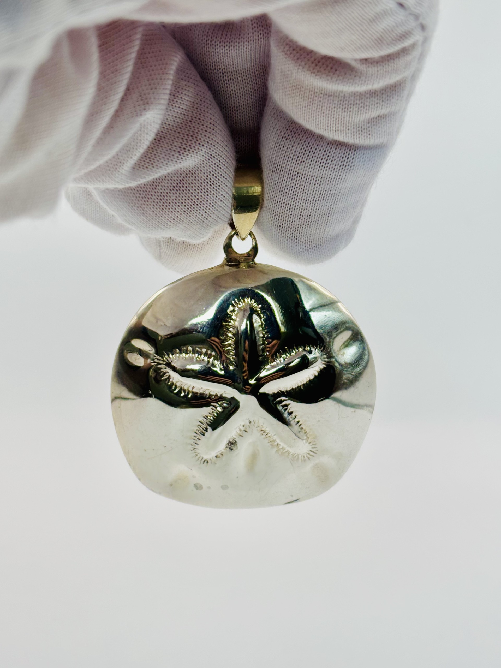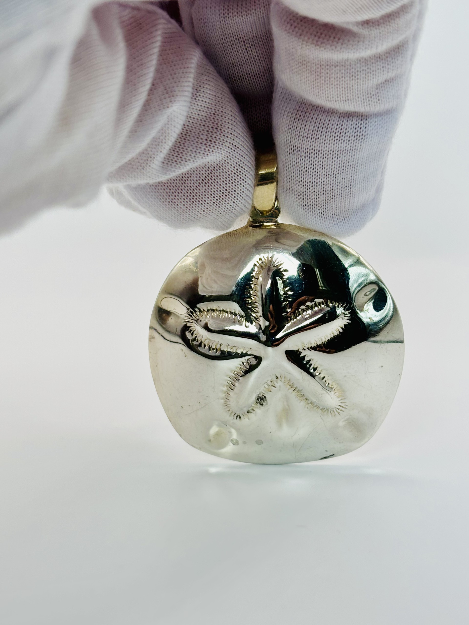 Sterling silver high polished sand dollar pendant with large bail. Size is 1 and 5/8 inches.