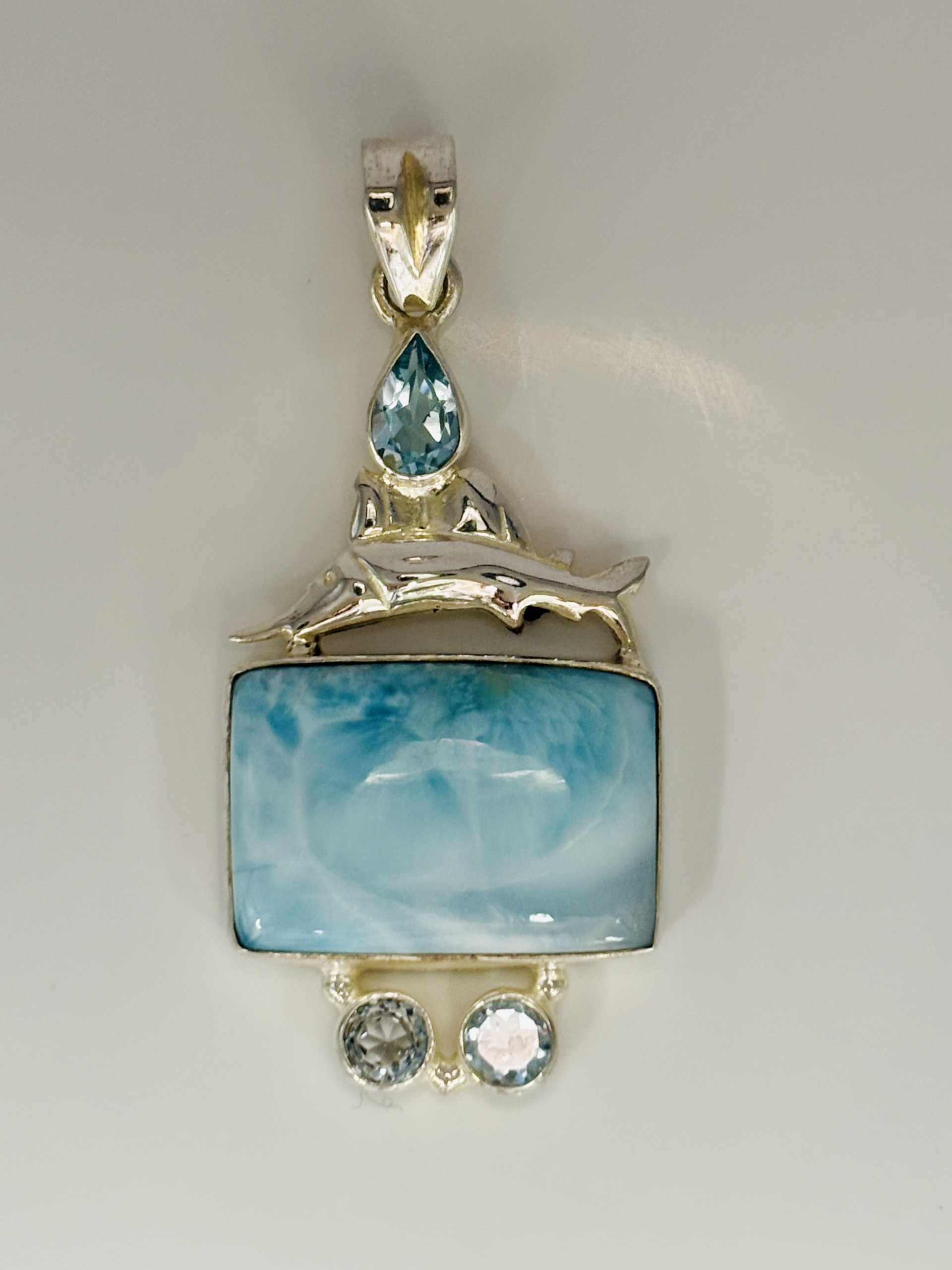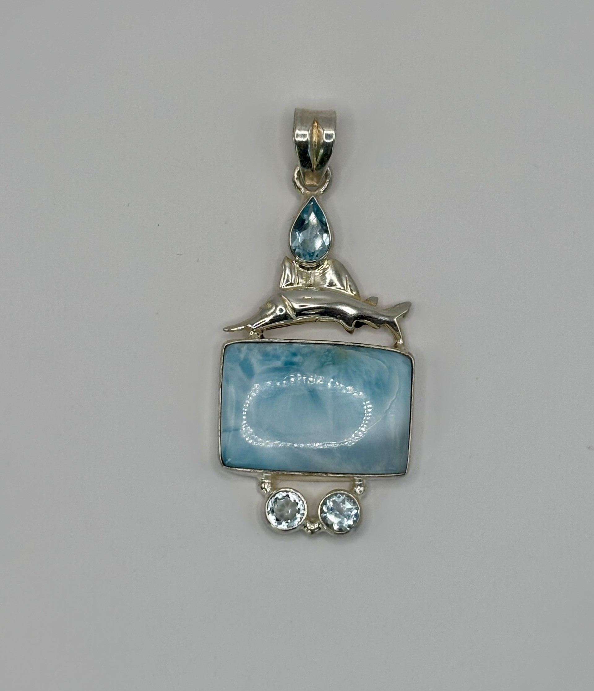 Sterling silver pendant set with a large larimar, accenting swiss blue topaz and sailfish. Bail can accommodate 5mm chain.