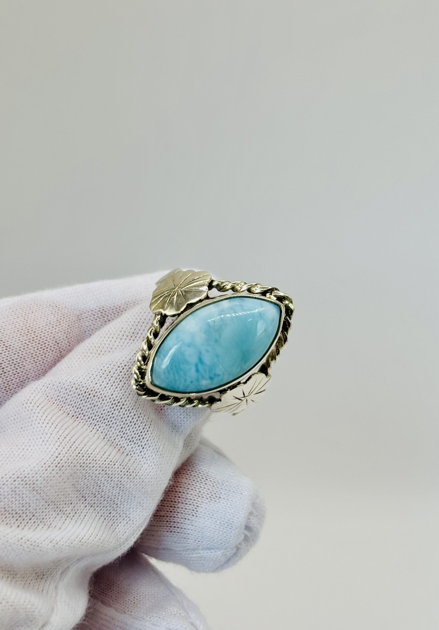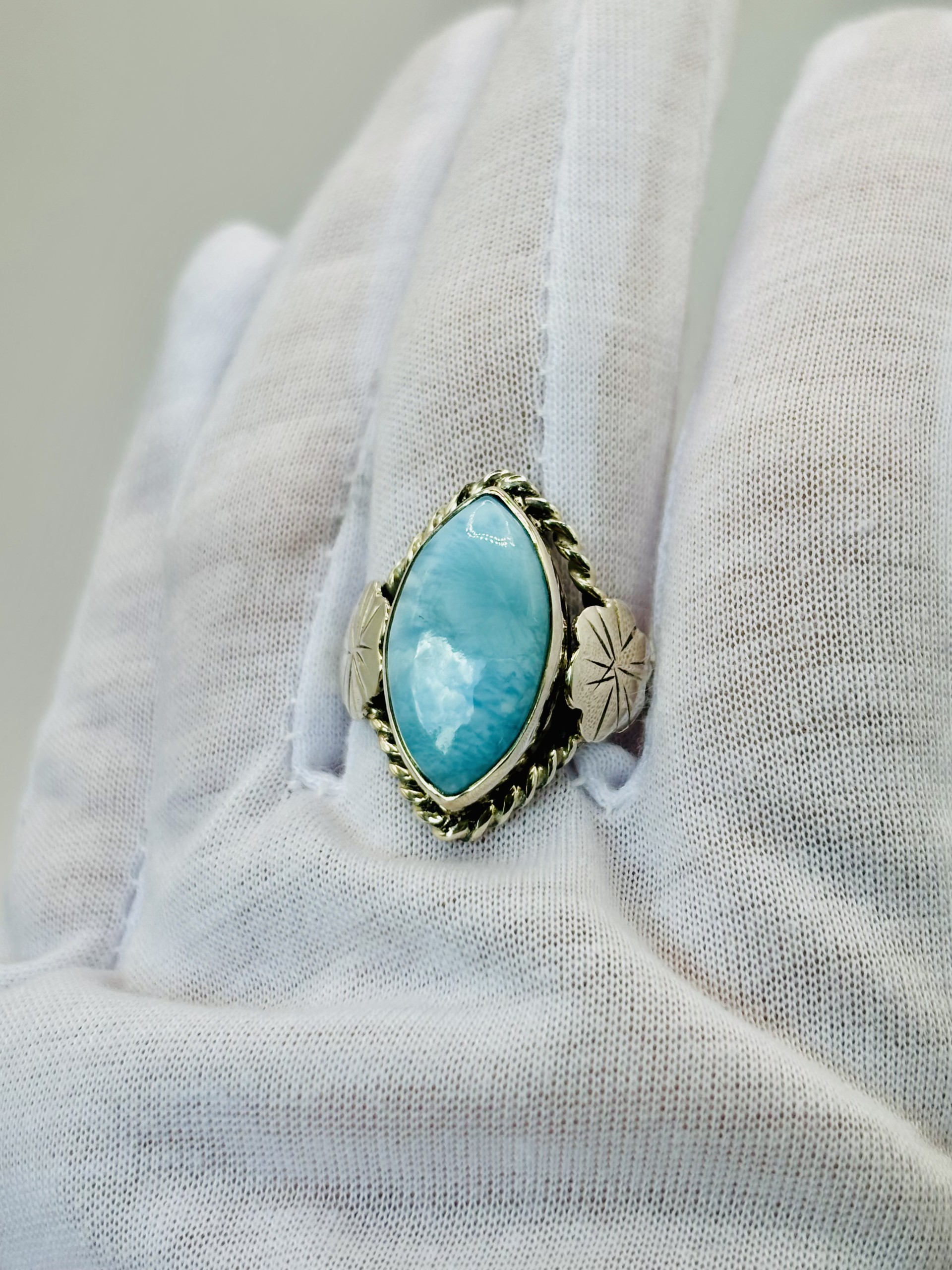Sterling silver ring with marquise shape larimar in bezel setting with rope detailing and flower detail each side. Ring size 8.5, not sizeable.