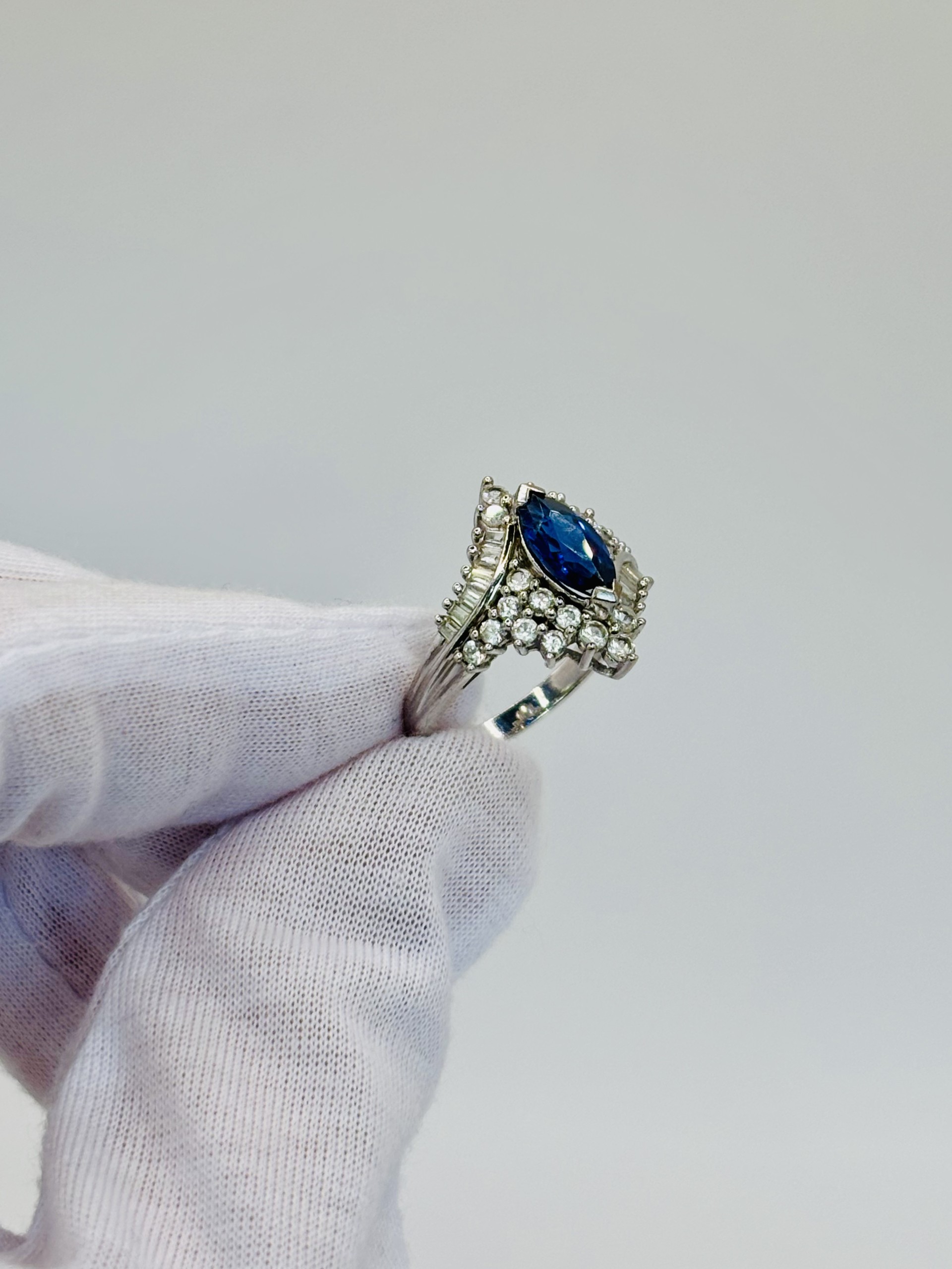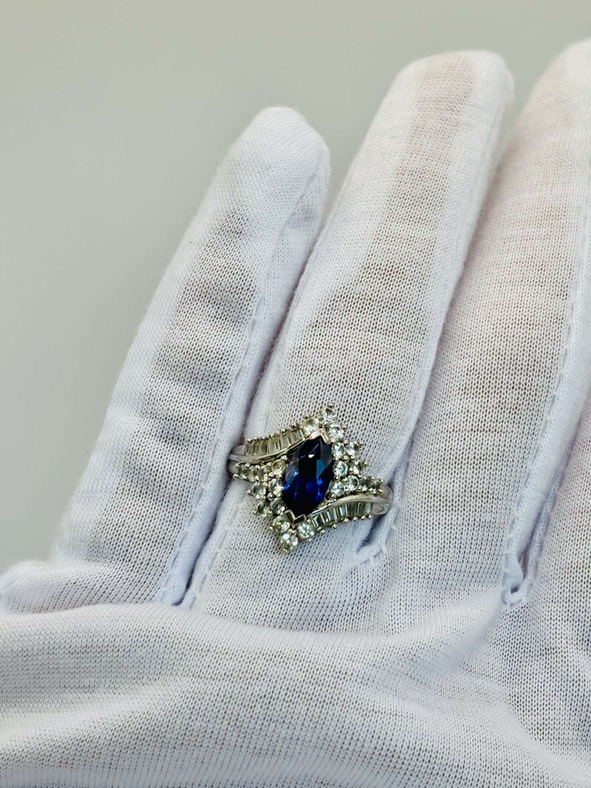 Sterling silver ring set with 1.75ct lab grown blue sapphire with round and baguette shape white topaz halo. Ring size 7, sizeable.