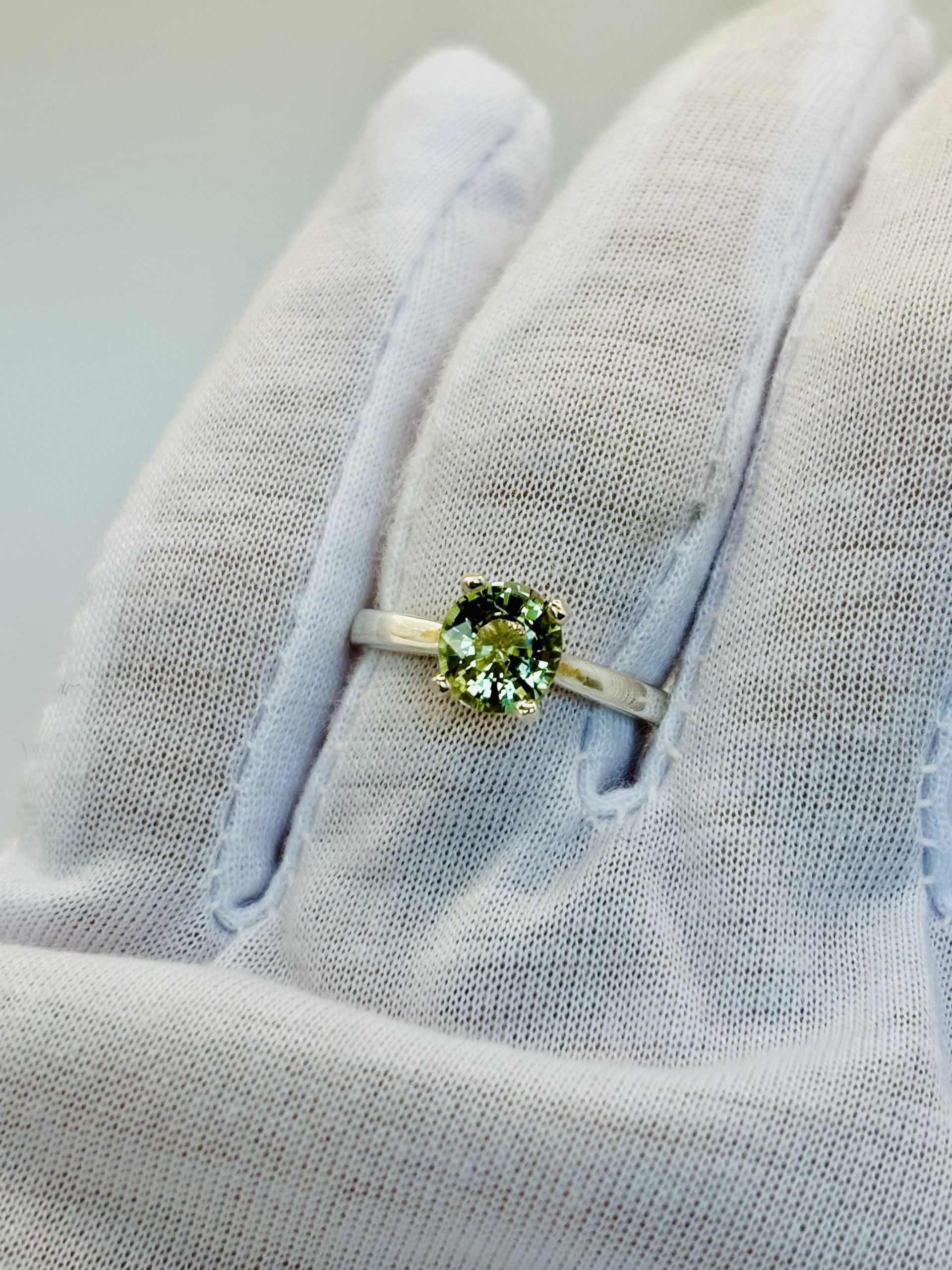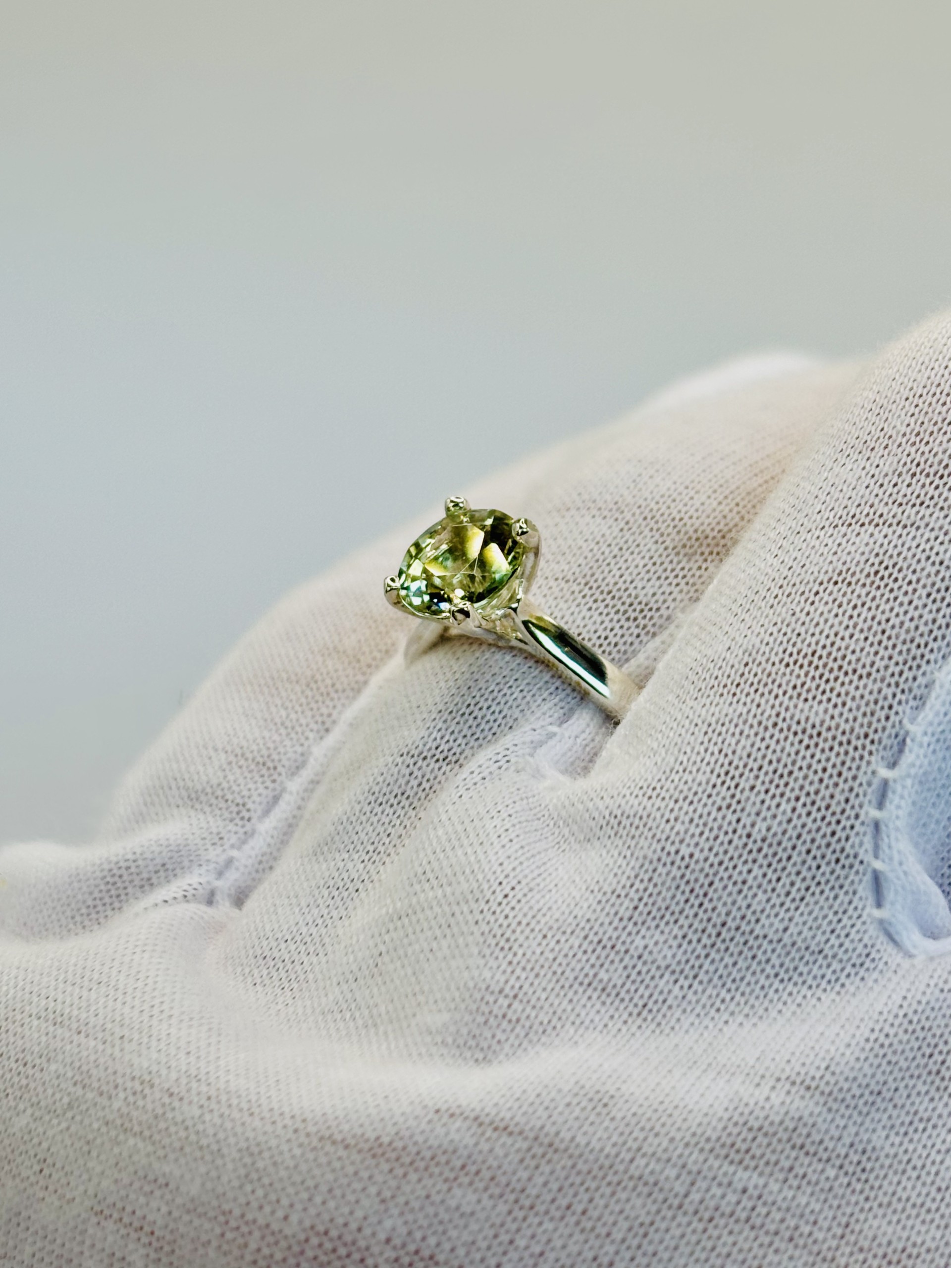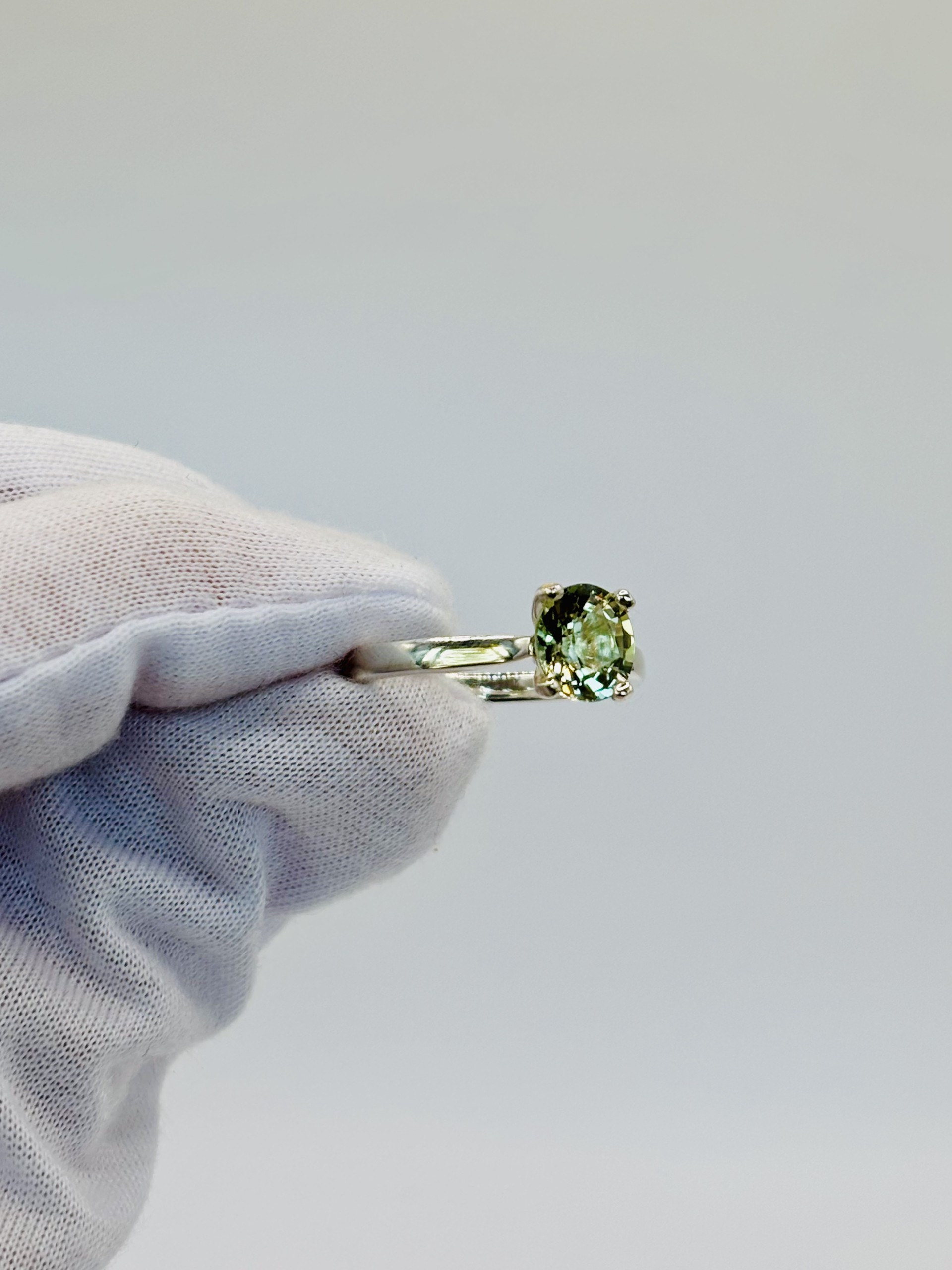 A serene beauty, this sterling silver solitaire ring features a soft pale green tourmaline at its center. The gentle hue warms the soul and calms the mind, radiating a natural elegance that’s effortlessly captivating. Very, very pretty — a timeless piece to treasure.