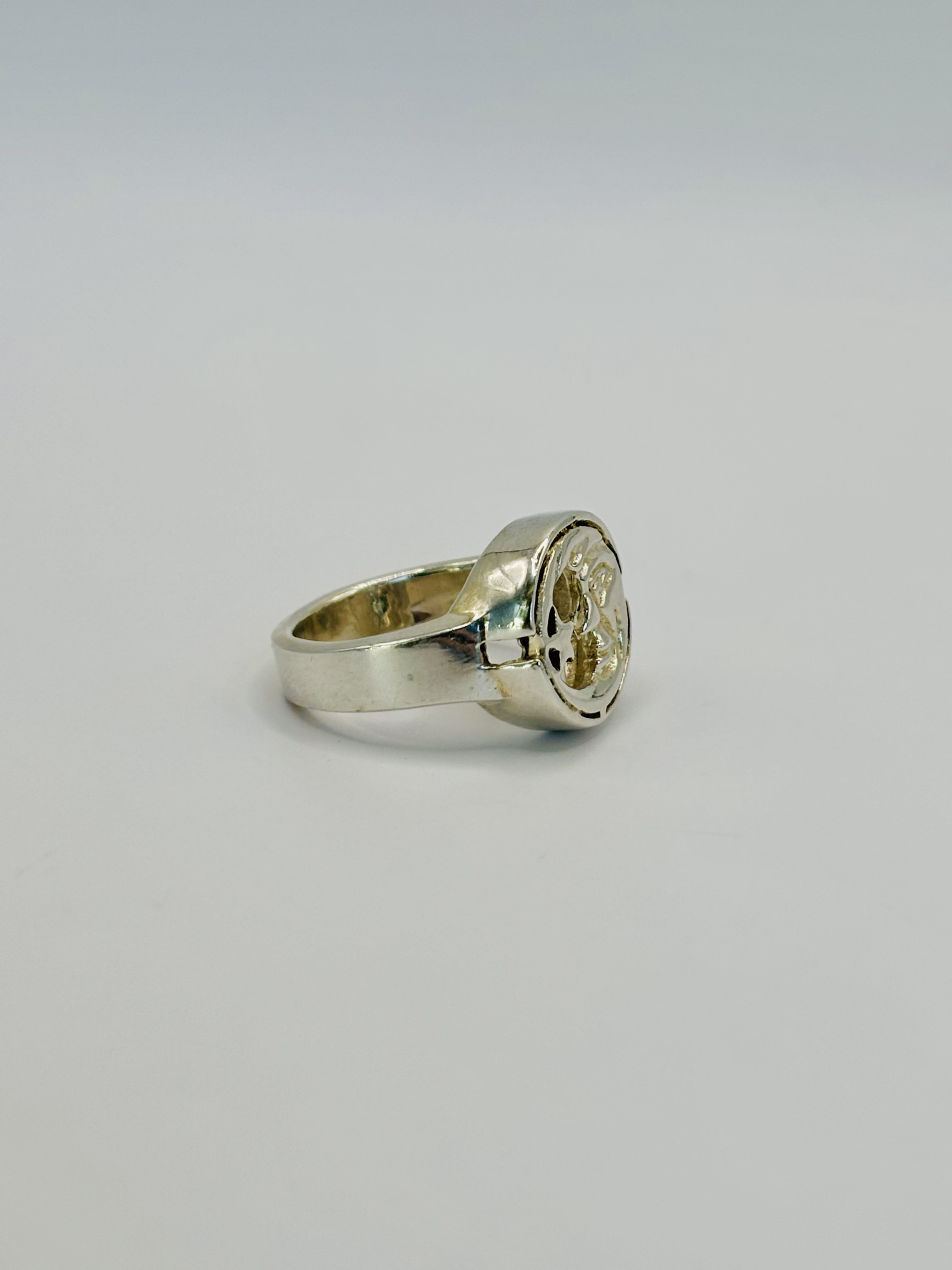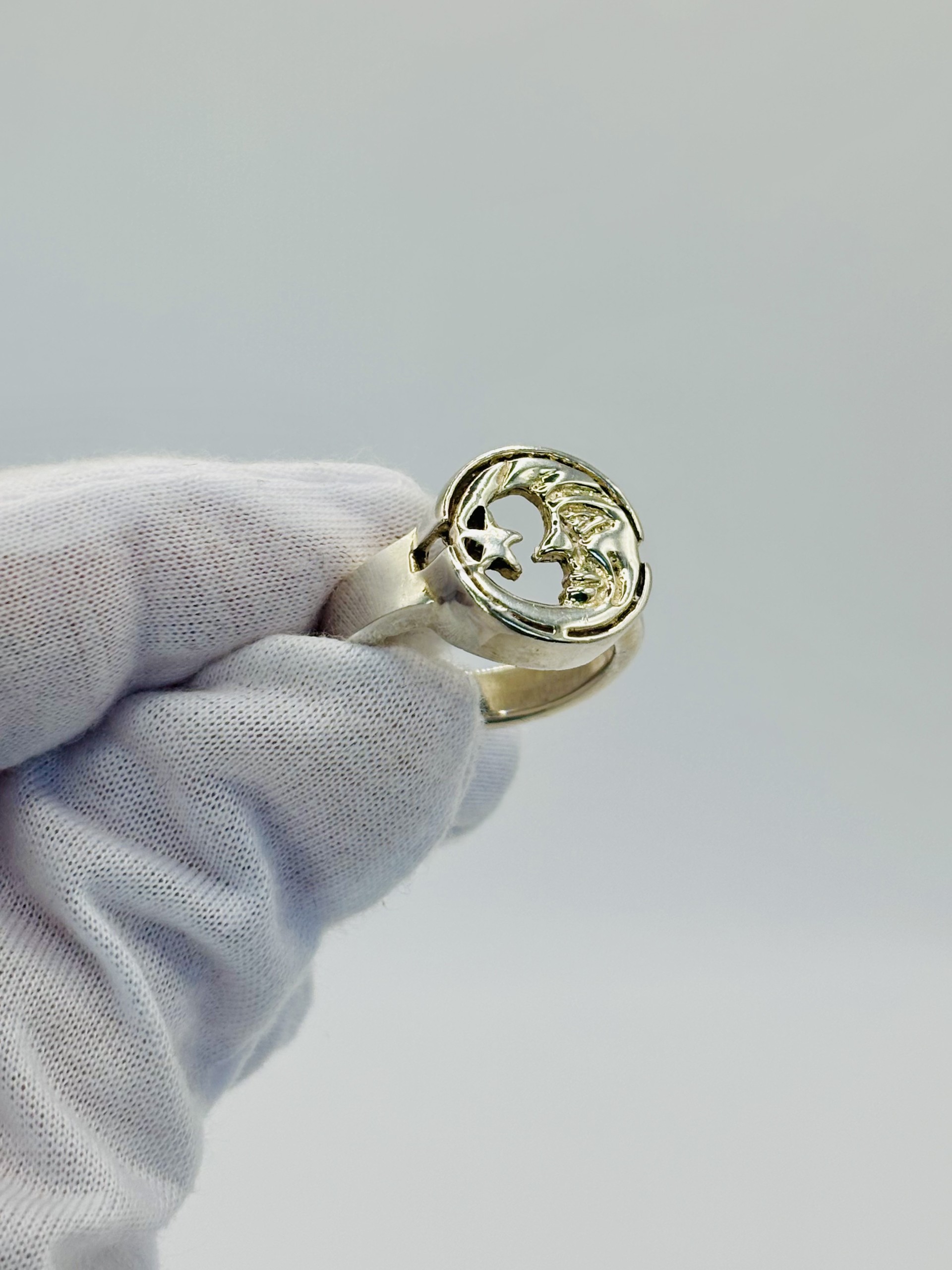 Sterling silver hefty ring with moon and star design in a signet style. Ring size 6.5, sizeable.