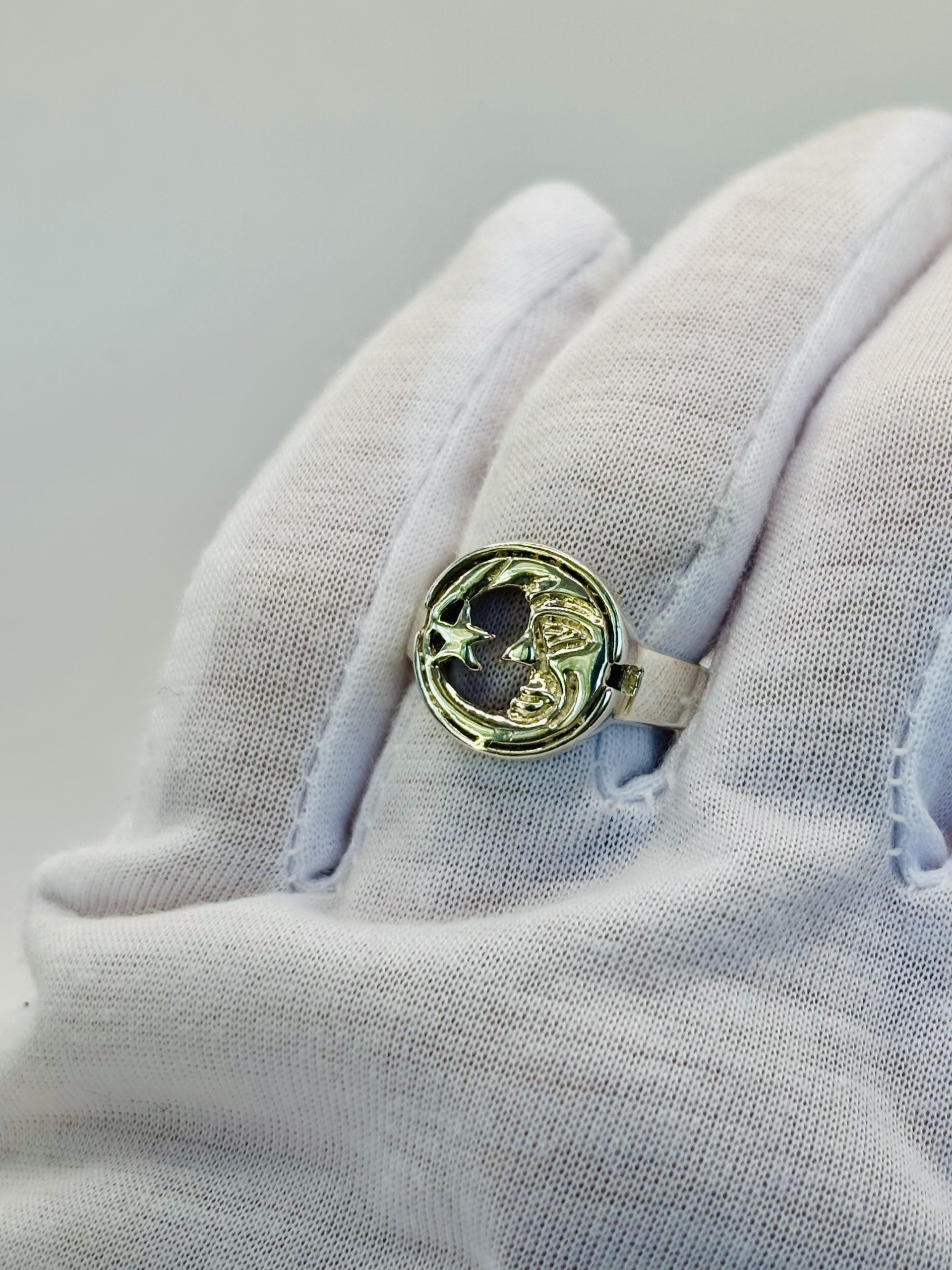 A bold sterling silver signet-style ring with a celestial touch. The face of the ring features a finely detailed crescent moon with a serene face, paired with a shining star beside it. Solid and substantial, this piece blends timeless symbolism with classic signet style—perfect for those drawn to the magic of the night sky.