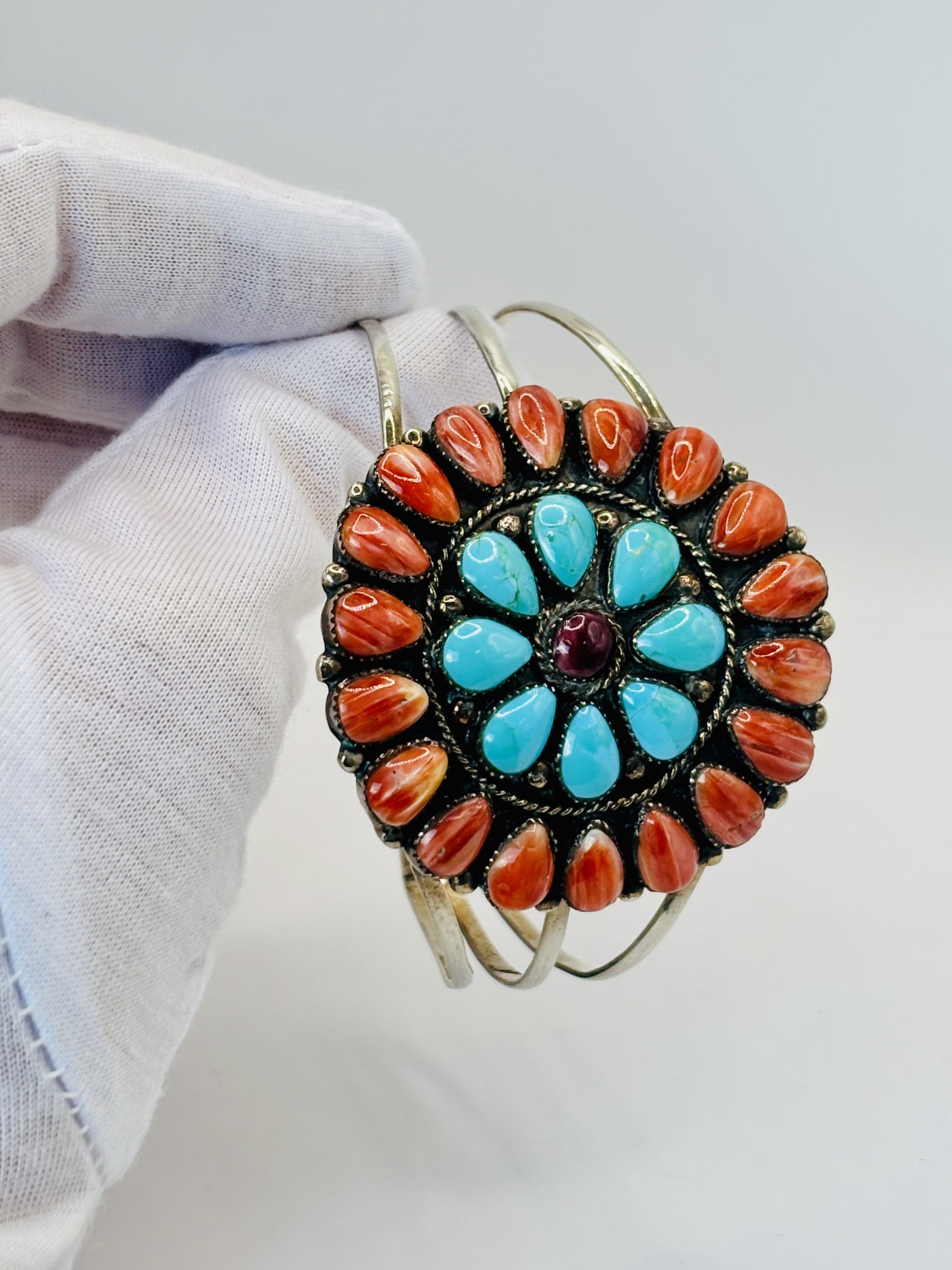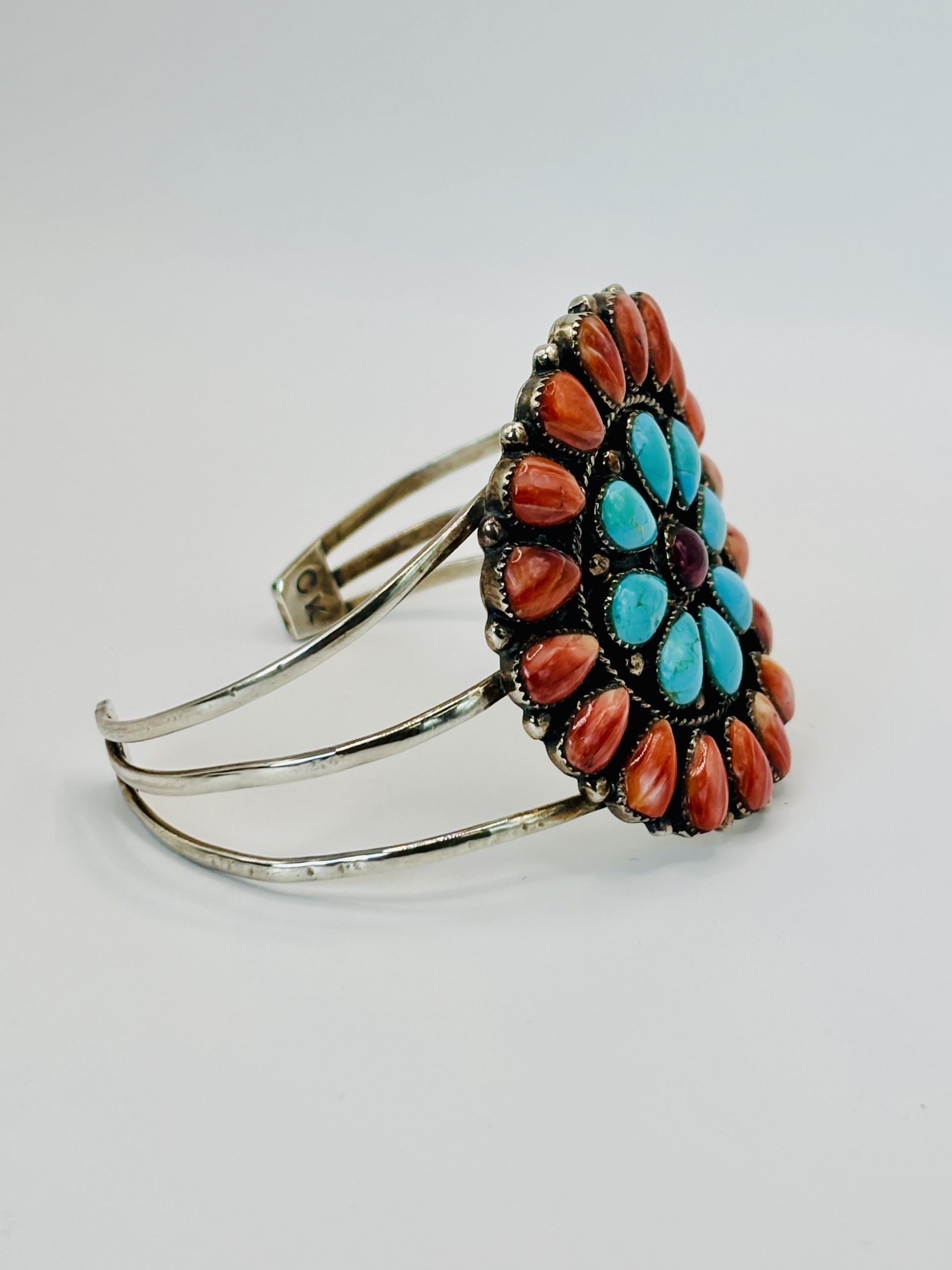 This striking cuff bracelet blends traditional Native American–inspired design with vibrant color. Handcrafted in sterling silver, it features a round center stone arranged in a flower-like motif—deep red spiny oyster, vivid turquoise, and rich purple spiny oyster radiate in harmony. The bold hues and intricate silverwork give this piece a timeless spirit, making it a true statement of artistry and heritage.