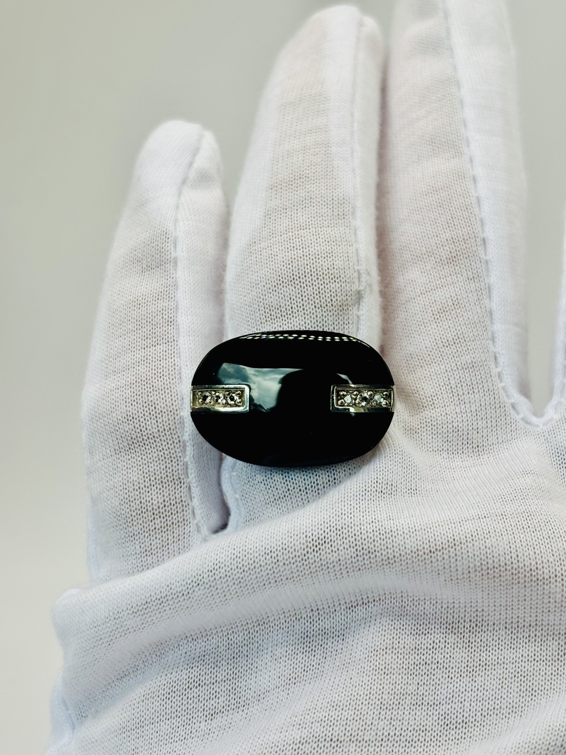 Sterling silver ring with sideways set oval onyx and cubic zirconia accents. Ring size 6, not sizeable.