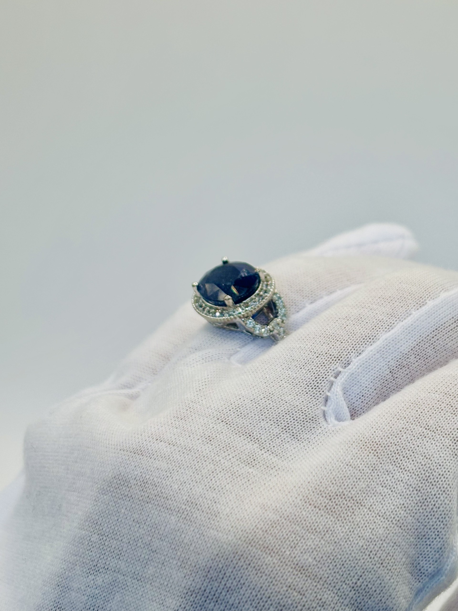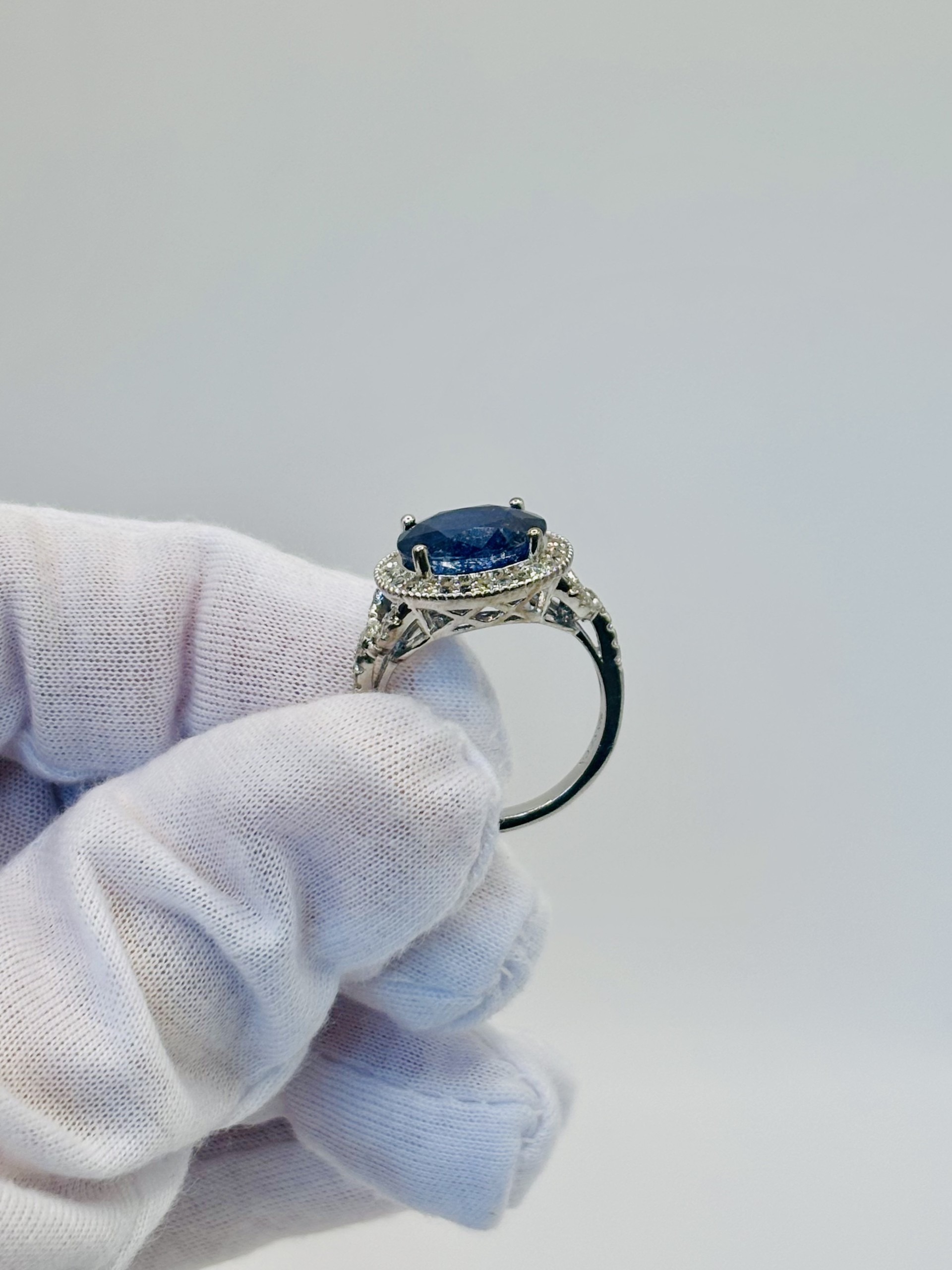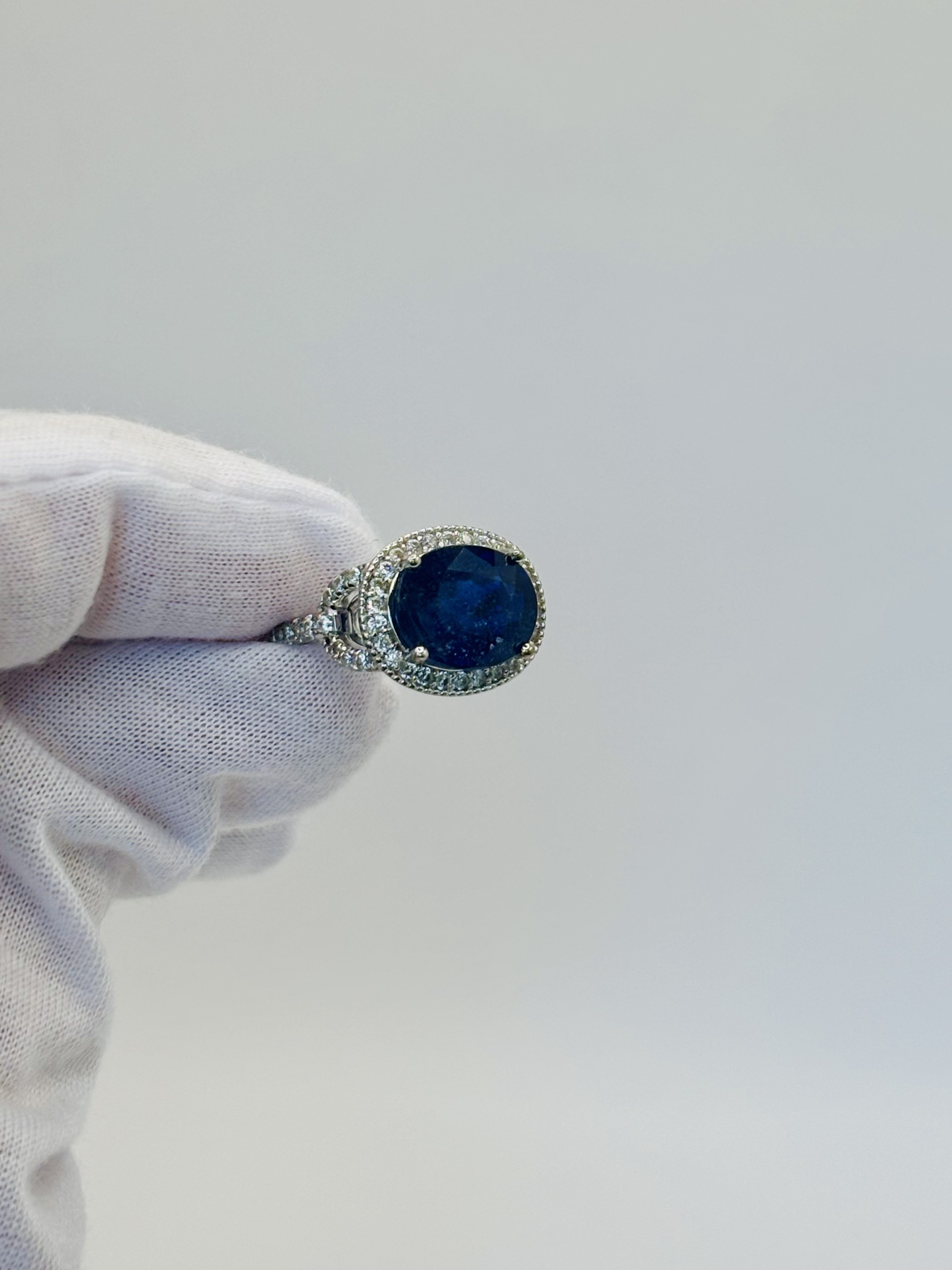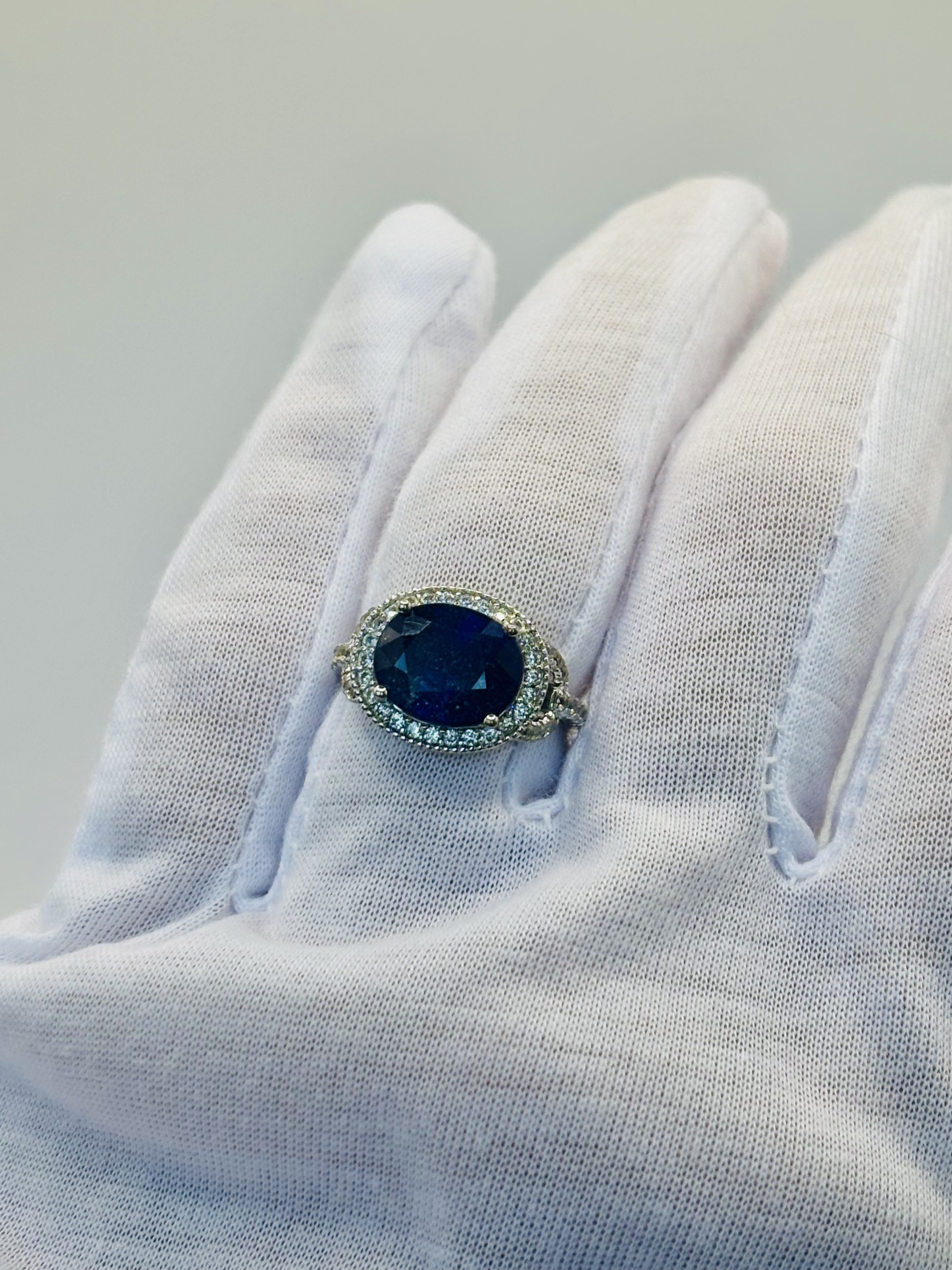 Sterling silver ring with an estimated 4.50ct oval midnight blue sapphire set east to west. Surrounded by a halo of white topaz, in a vintage style setting. Ring size 6, sizeable.