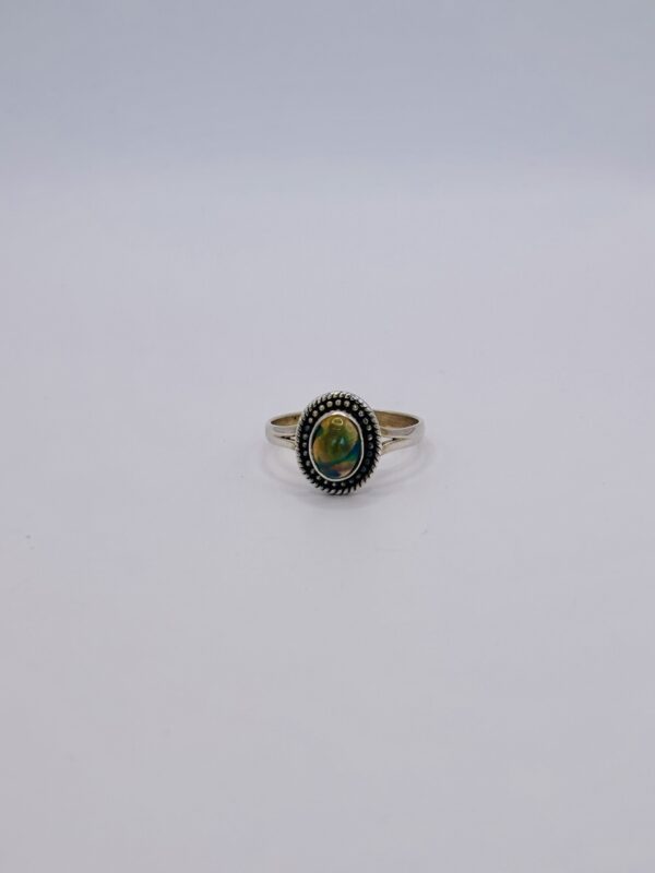 This oval cabochon smoked jelly Ethiopian opal glows with a soft, ethereal light — its translucent smoky body revealing flashes of green, gold, and pink that shift with every angle. Set in a polished silver bezel, the stone is framed by a detailed silver halo with intricate accents that highlight its otherworldly glow. Delicate yet striking, this ring captures the subtle mystery of the smoked jelly opal, offering a modern twist on October’s birthstone. It’s a piece that feels luminous, personal, and quietly enchanting, celebrating the stone’s unique depth and captivating translucence.