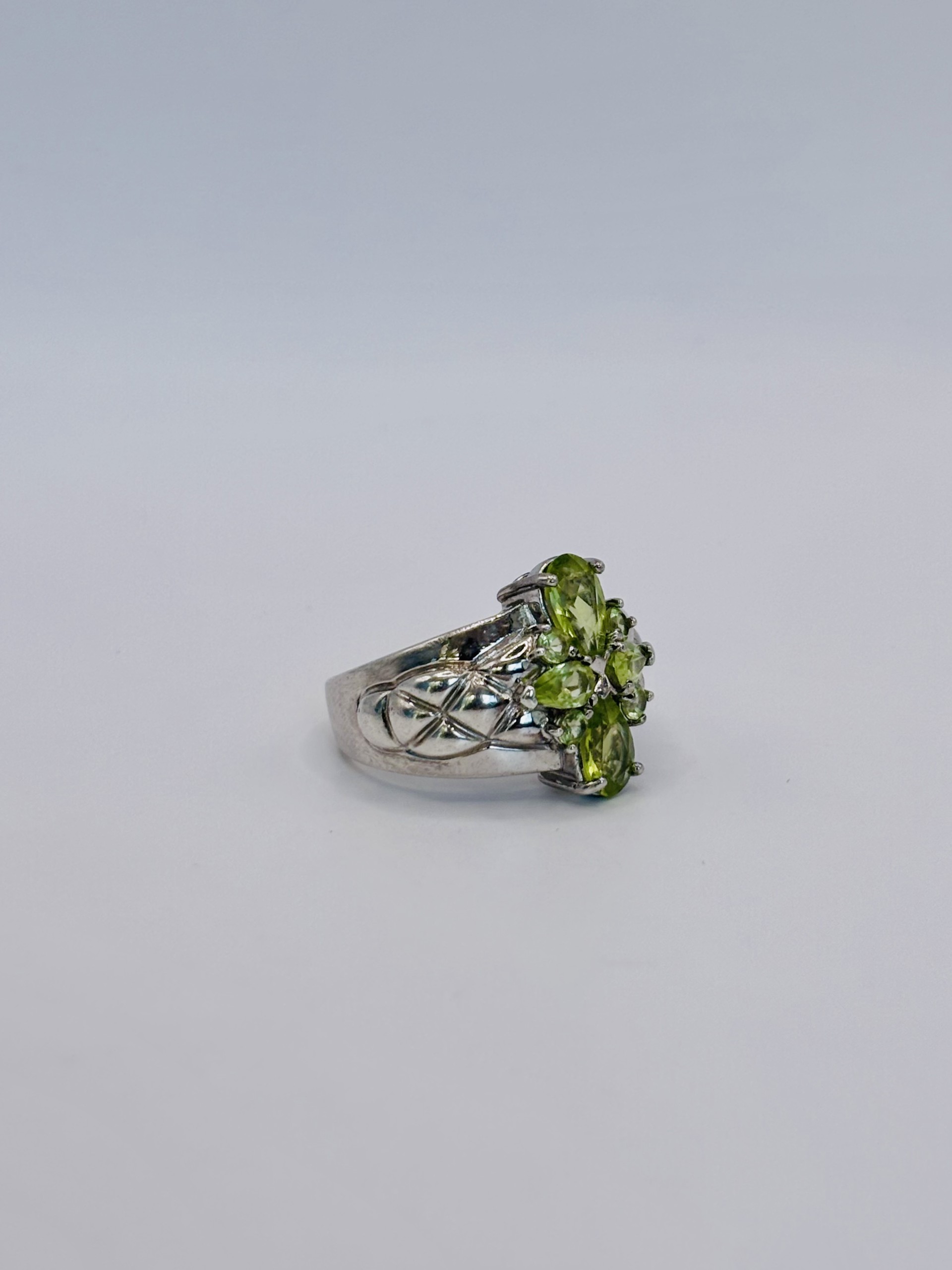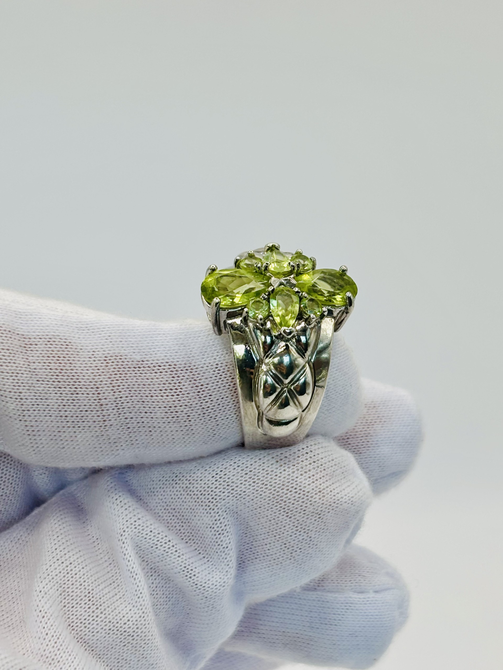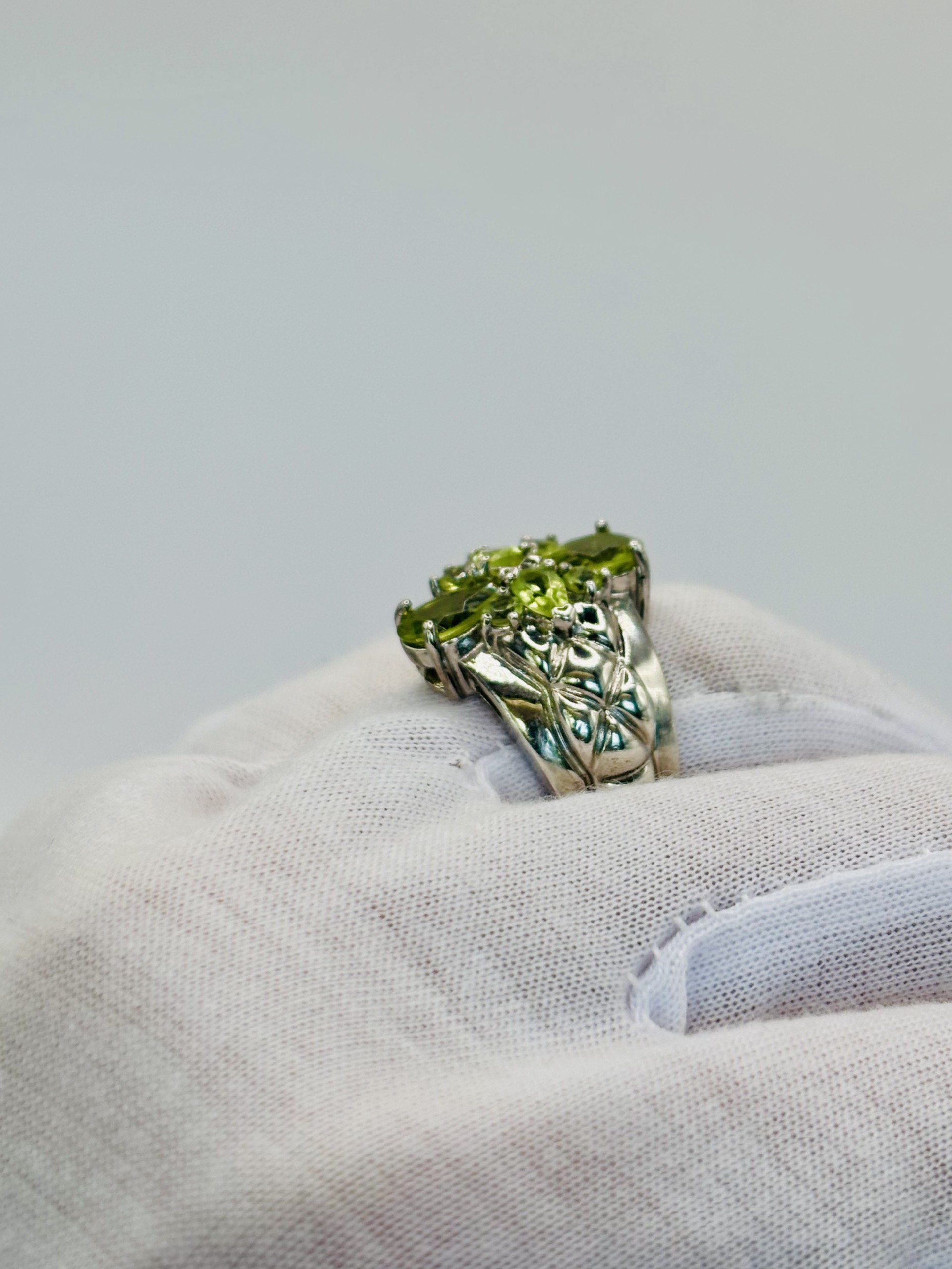 This wide sterling silver ring makes a striking statement with its bold presence and refined details. The shank is adorned with a quilted pattern along the sides, adding texture and sophistication. At the center, a lively cluster of peridot gems shines in refreshing green hues — round cuts sparkle alongside four pear-shaped peridots, arranged in an elegant, harmonious design. A beautiful blend of craftsmanship and vibrant color, this ring is both eye-catching and timeless.