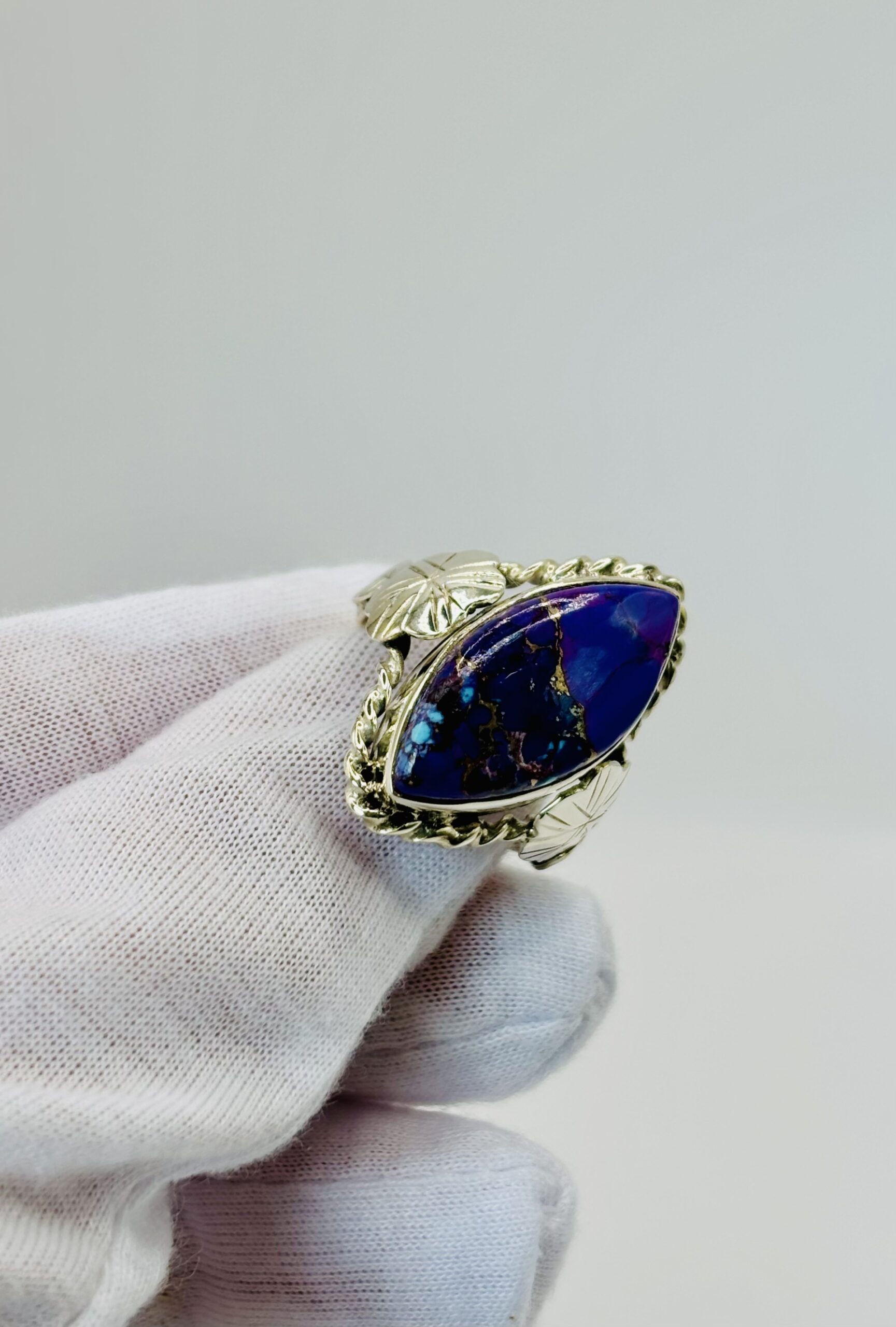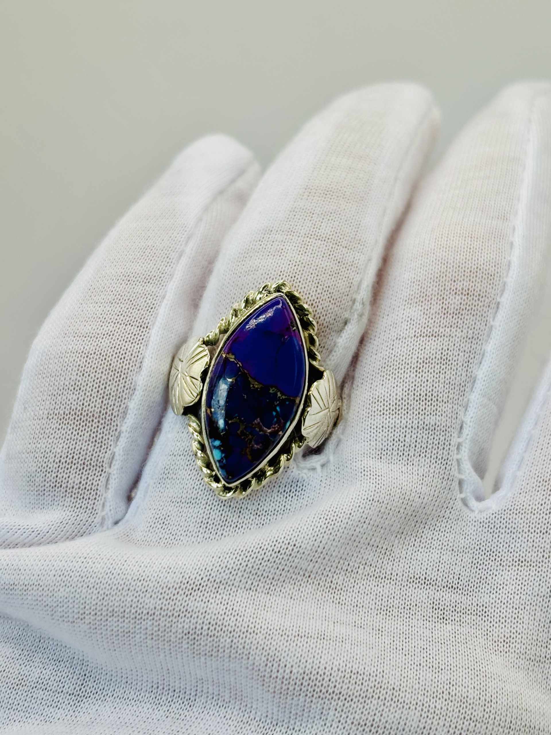A rare beauty, this sterling silver ring showcases a marquise-shaped Purple Kingman turquoise, bezel set and framed with delicate rope detailing. On each side, hand-worked silver flowers and leaves embrace the stone, adding a touch of natural elegance. With its vibrant color and intricate design, this piece blends Southwestern charm with timeless artistry.