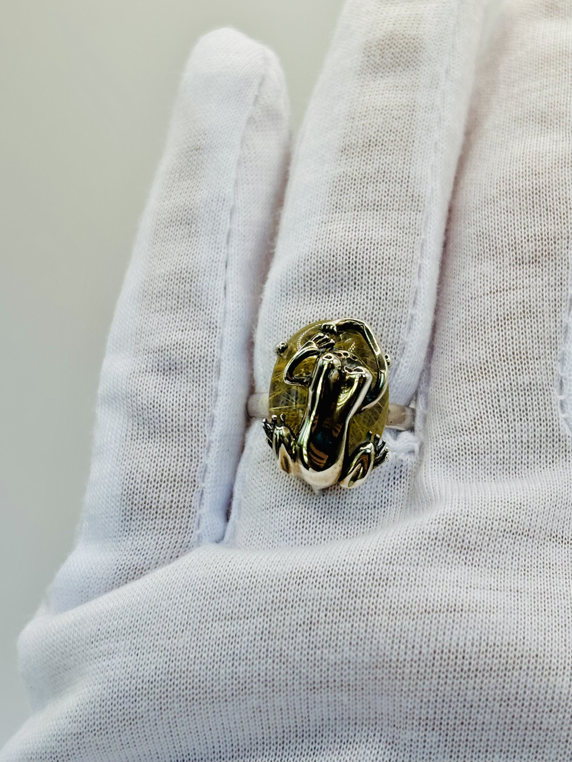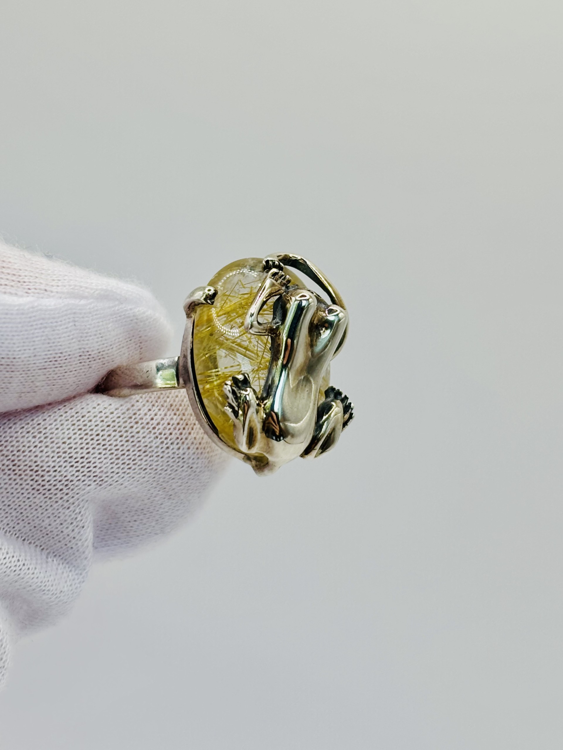 Imagine a striking rutilated quartz ring that immediately draws the eye with its ethereal, golden threads suspended inside a clear, glassy stone — a natural mosaic of fine rutile needles crisscrossing like lightning or spun sunlight. Sitting boldly atop the quartz is a meticulously sculpted silver frog. This ring is a one-of-a-kind fusion of nature and artistry, where a lifelike silver frog perches atop a golden-threaded rutilated quartz, turning jewelry into a miniature, enchanted world.