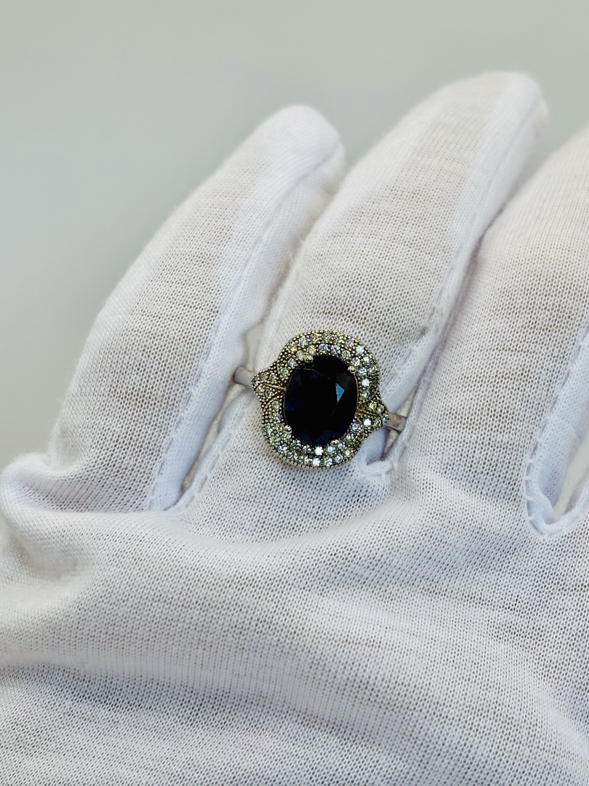 Sterling silver ring set with oval blue sapphire accented with a double halo of cubic zirconias. Ring size 7, sizeable.