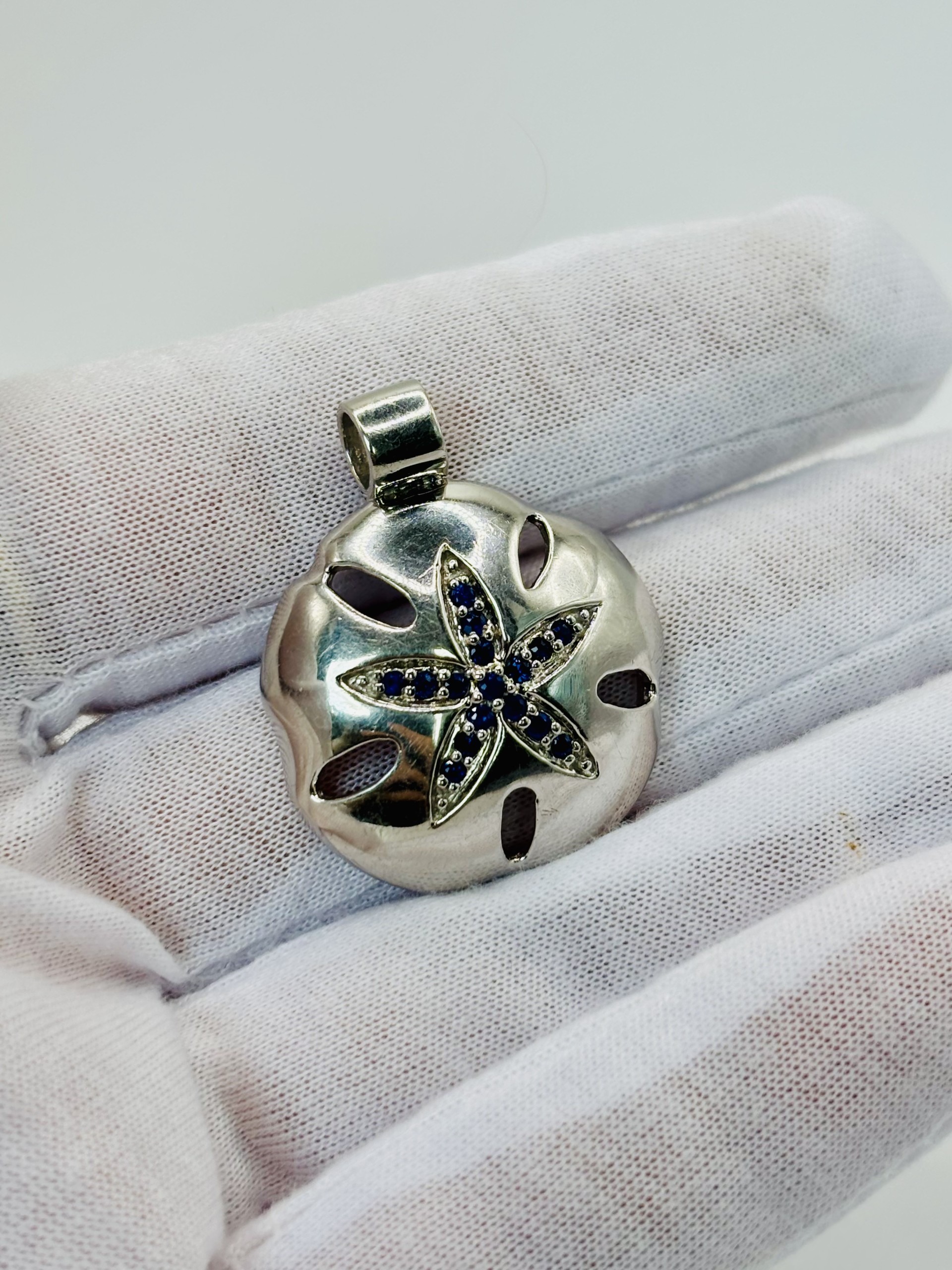 Sterling silver sand dollar pendant with 16 round blue sapphires in the center star. 1″ sand dollar, pendant only. Chain not included.