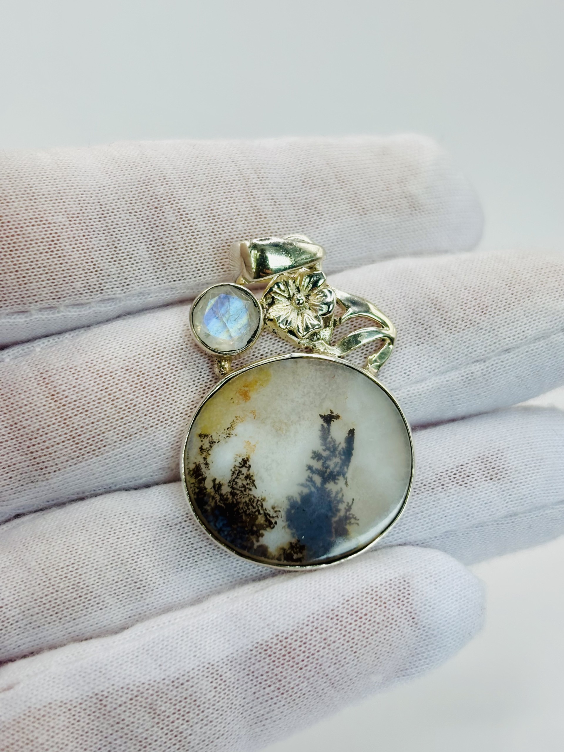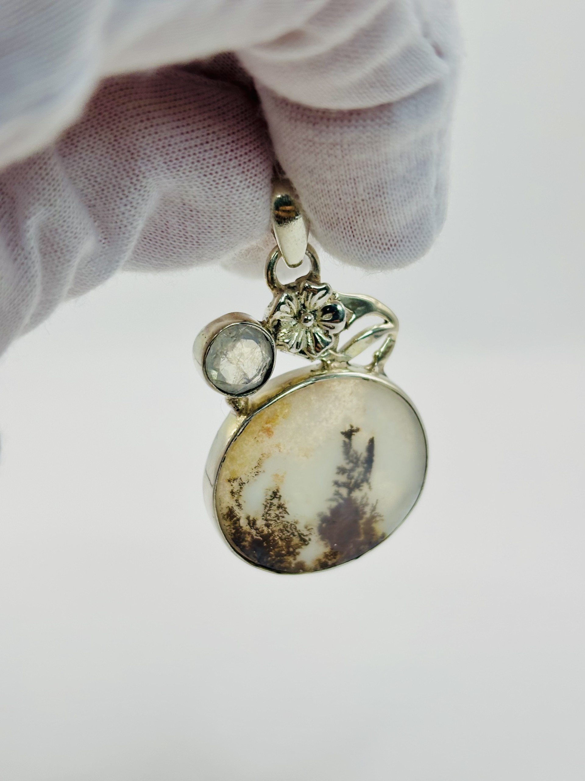 A one-of-a-kind sterling silver pendant featuring the rare and enchanting Shazar stone. Found only in the riverbeds of India, Shazar stones are a unique variety of agate known for their natural inclusions that resemble delicate, moss-like patterns or miniature landscapes—each one formed by nature’s hand and never repeated. This captivating centerpiece is beautifully accented with the soft, glowing shimmer of a faceted moonstone and a finely detailed silver flower, adding both charm and elegance. A truly natural treasure, it celebrates the beauty of stones in their most artistic, untouched form.
