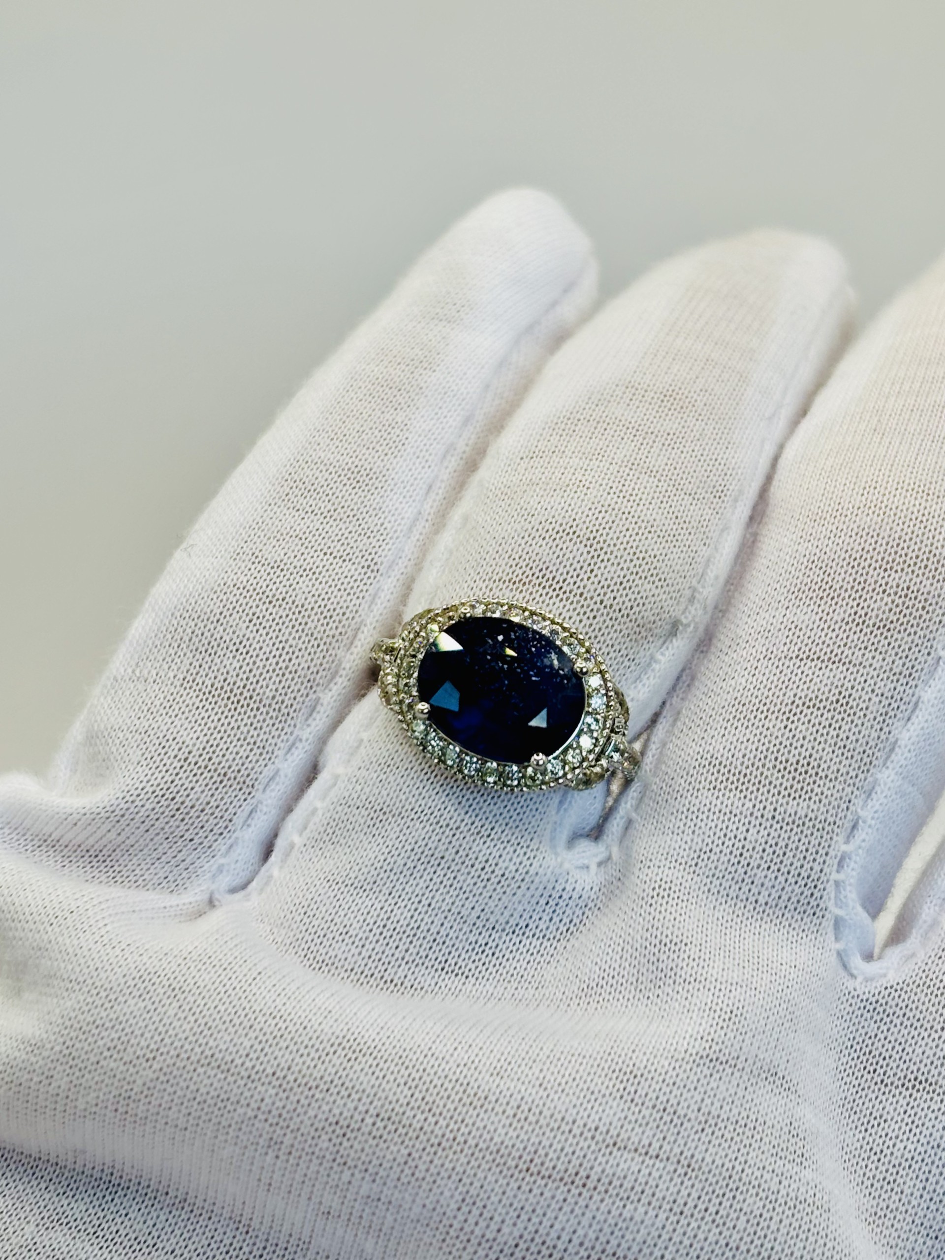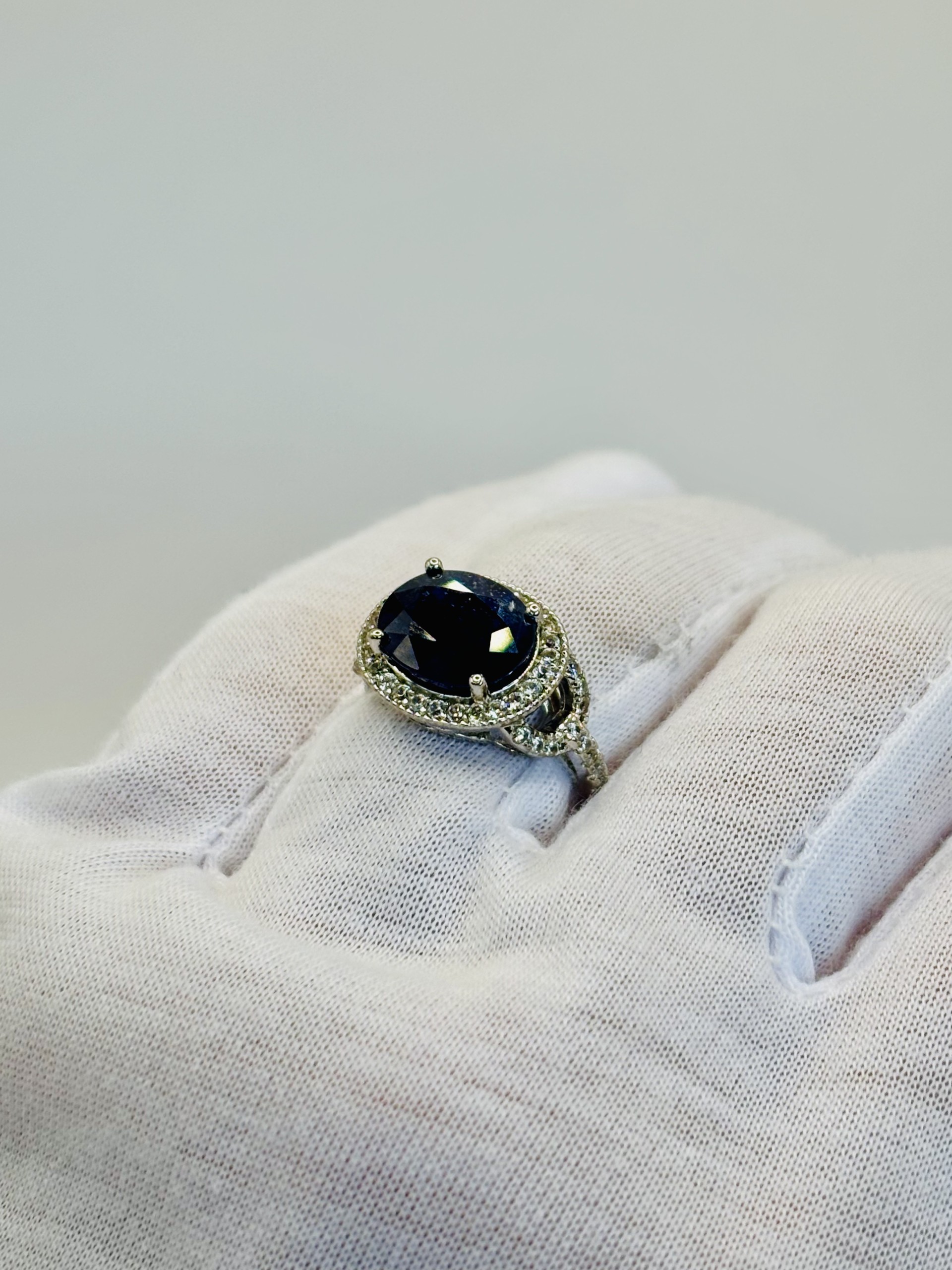 This beautiful sterling silver ring captures the wonder of a galaxy within its centerpiece. The oval sapphire, set in a striking east-to-west orientation, shimmers with cosmic depth—its rich blue tones seeming to hold starlit mystery inside. Encircling the stone is a radiant halo of white topaz, adding a constellation-like sparkle that enhances the sapphire’s celestial glow. Delicate accented designs on each side of the center complete the look, giving the ring subtle character and charm. Stylish yet versatile, this piece is perfect for everyday wear while still offering a touch of timeless elegance.
