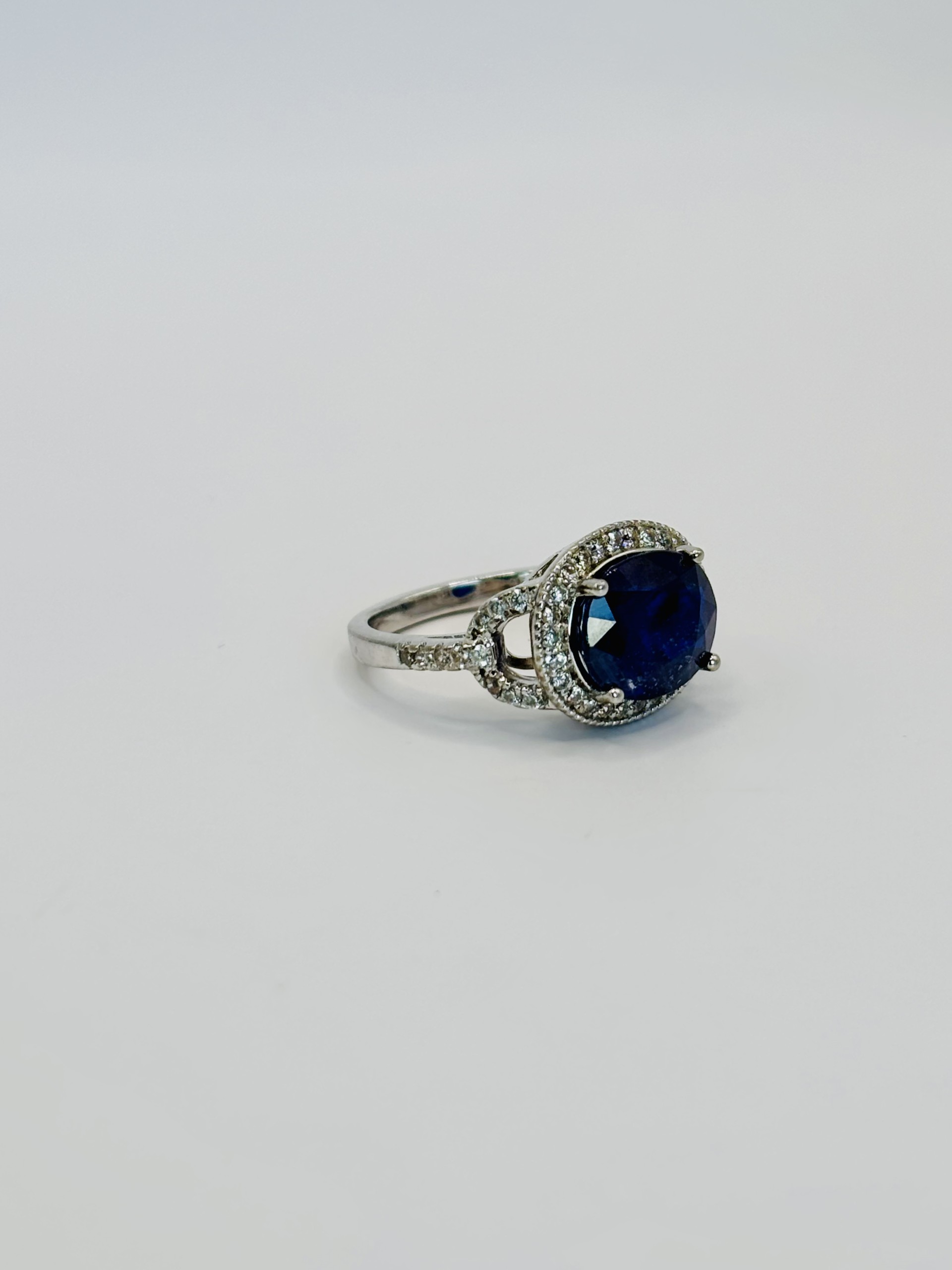 Sterling silver ring set with an east to west oval, blue sapphire surrounded by a white topaz halo. Ring size 6, sizeable.