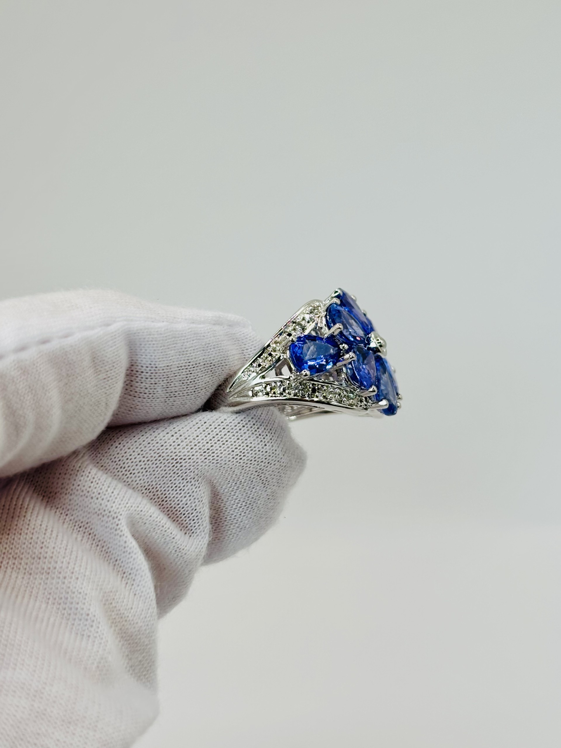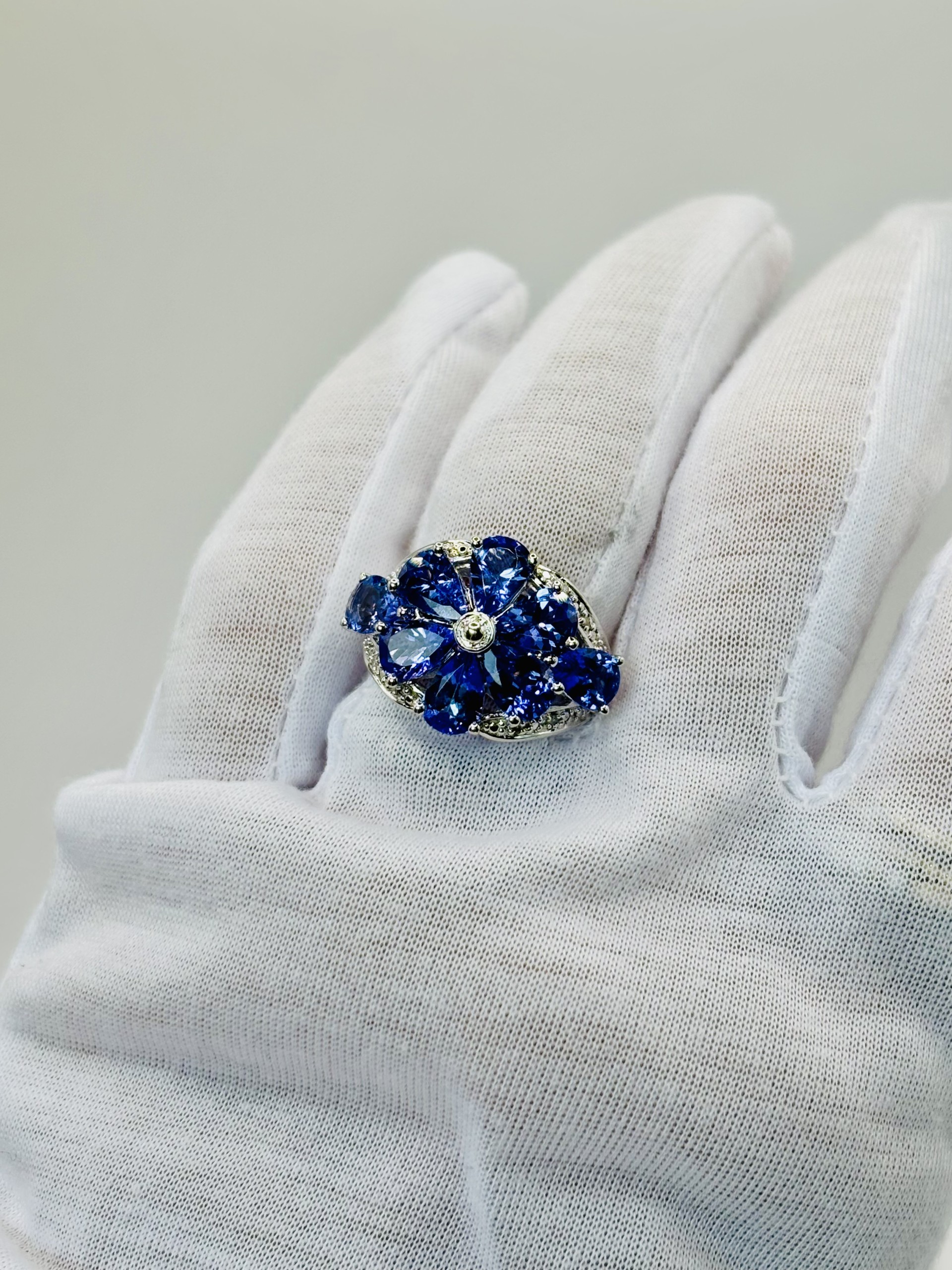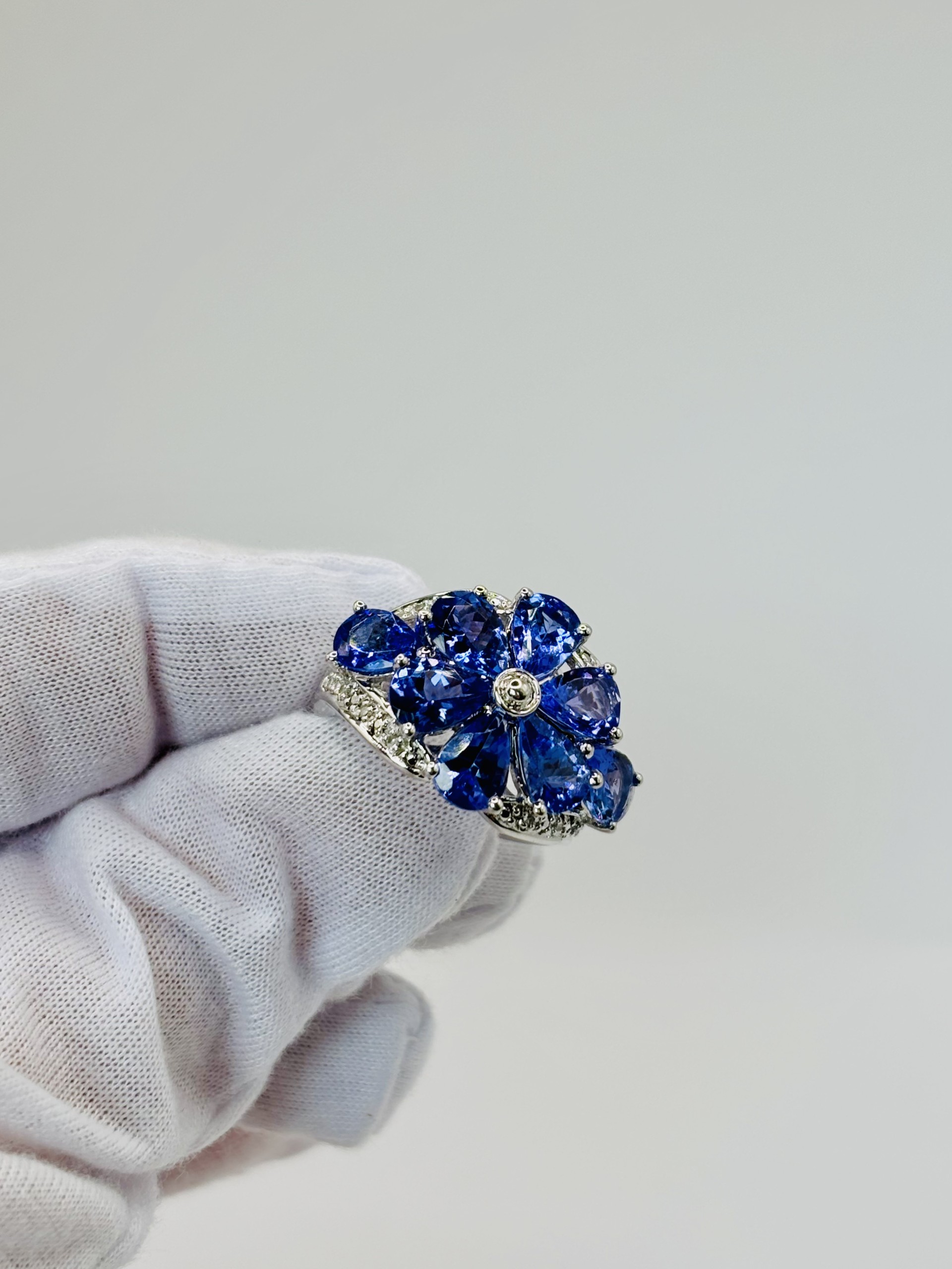 A truly stunning statement piece, this ring blooms with beauty in the form of a dazzling flower. Each petal is crafted from vivid pear-shaped tanzanites, radiating their rich violet-blue hues in a captivating floral design. Set in a sleek sterling silver mounting with sparkling diamond accents that catch the light from every angle, adding brilliance and depth. This eye-catching ring combines elegance and whimsy, making it the perfect piece for those who love jewelry that feels both enchanting and unforgettable.