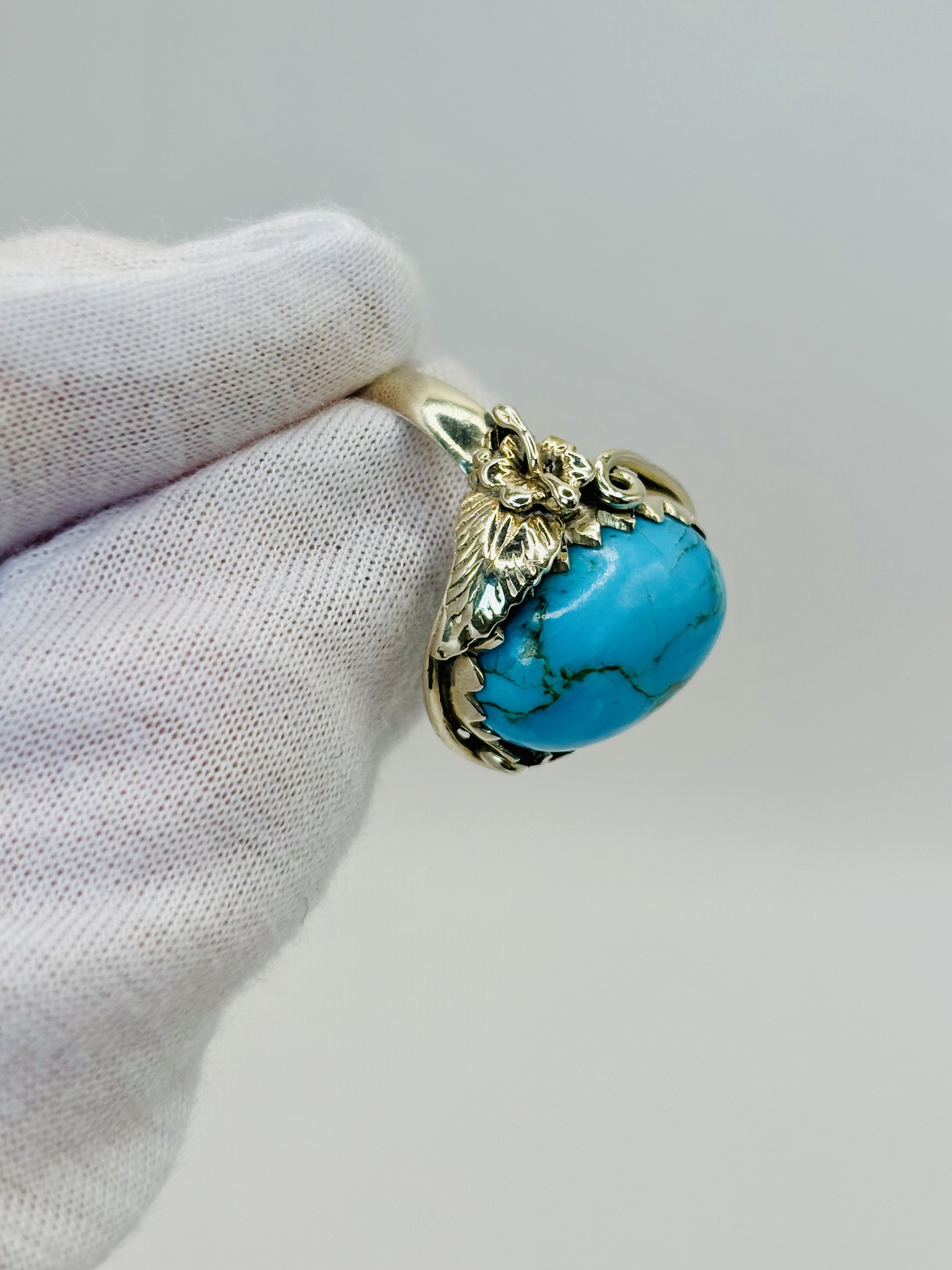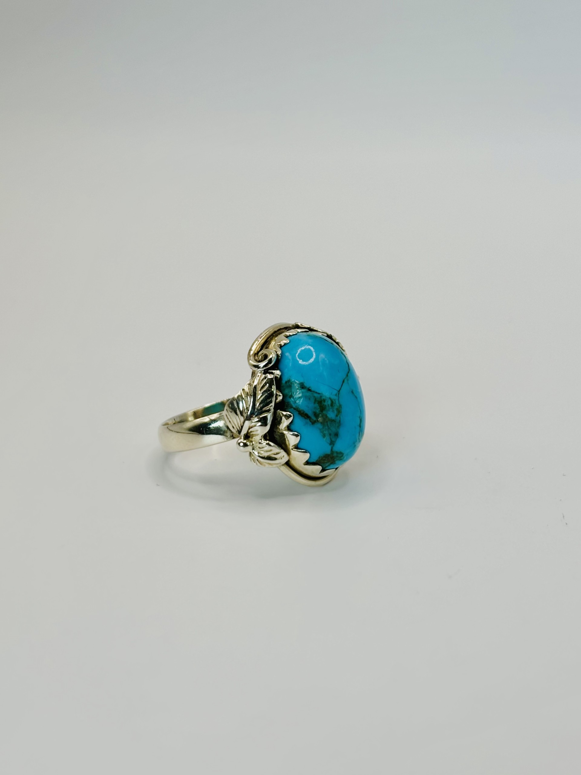 This striking ring features a stunning blue turquoise cabochon, set securely in a pointy prong bezel that highlights the stone’s vivid hue. Sterling silver flowers and leaves adorn each side of the band, adding a touch of nature-inspired artistry. A perfect blend of elegance and craftsmanship, this piece is both timeless and unique.