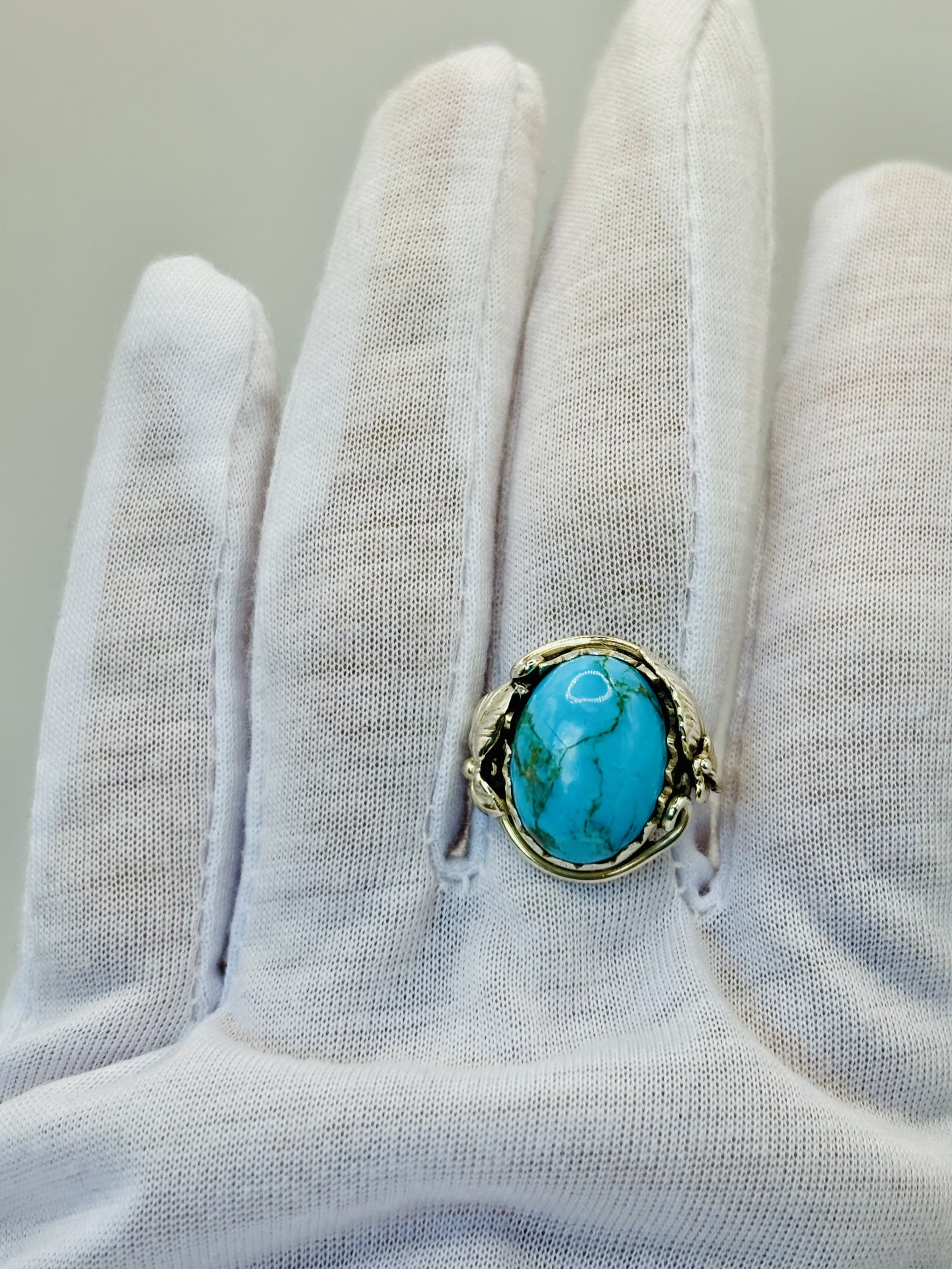 Sterling silver ring with oval cabochon natural turquoise with leaf and flower motifs on each side. Ring size 8, not sizeable.